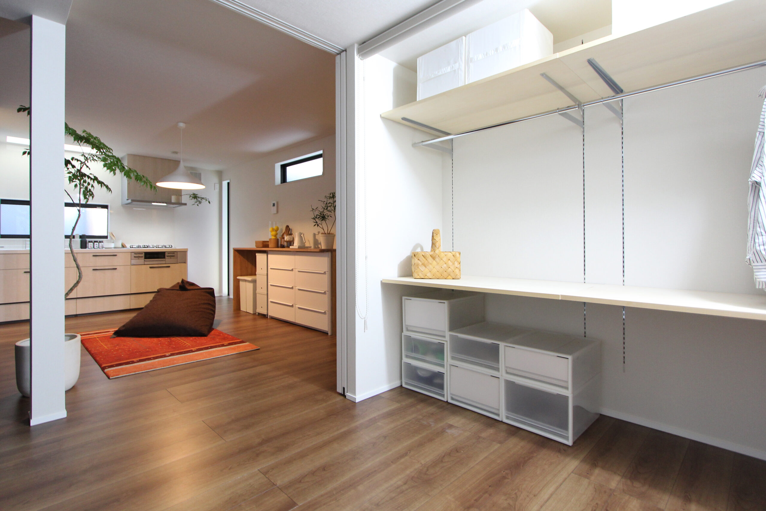 キッチンの先には、パントリーとしても使える大容量の収納スペースを計画しました。食品や日用品のストックに加え、お子様の学習用具もまとめて収納できる構成としています。生活感が出やすいものを一か所に集約することで、キッチンまわりをすっきりと保ち、日々の家事をスムーズに支えます。