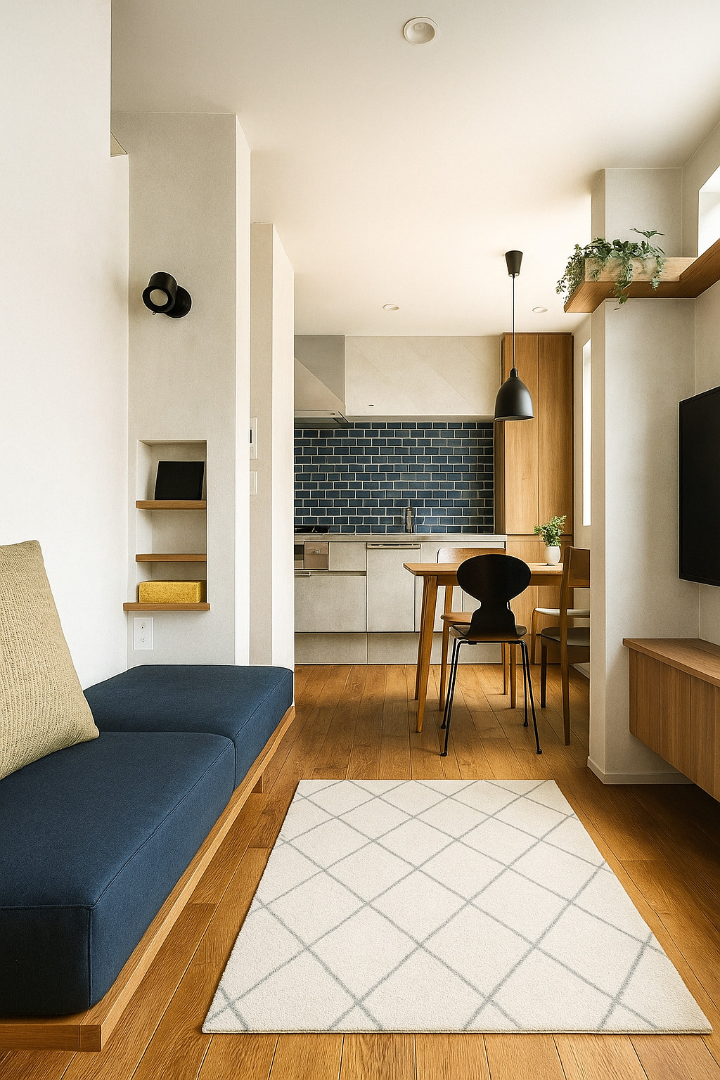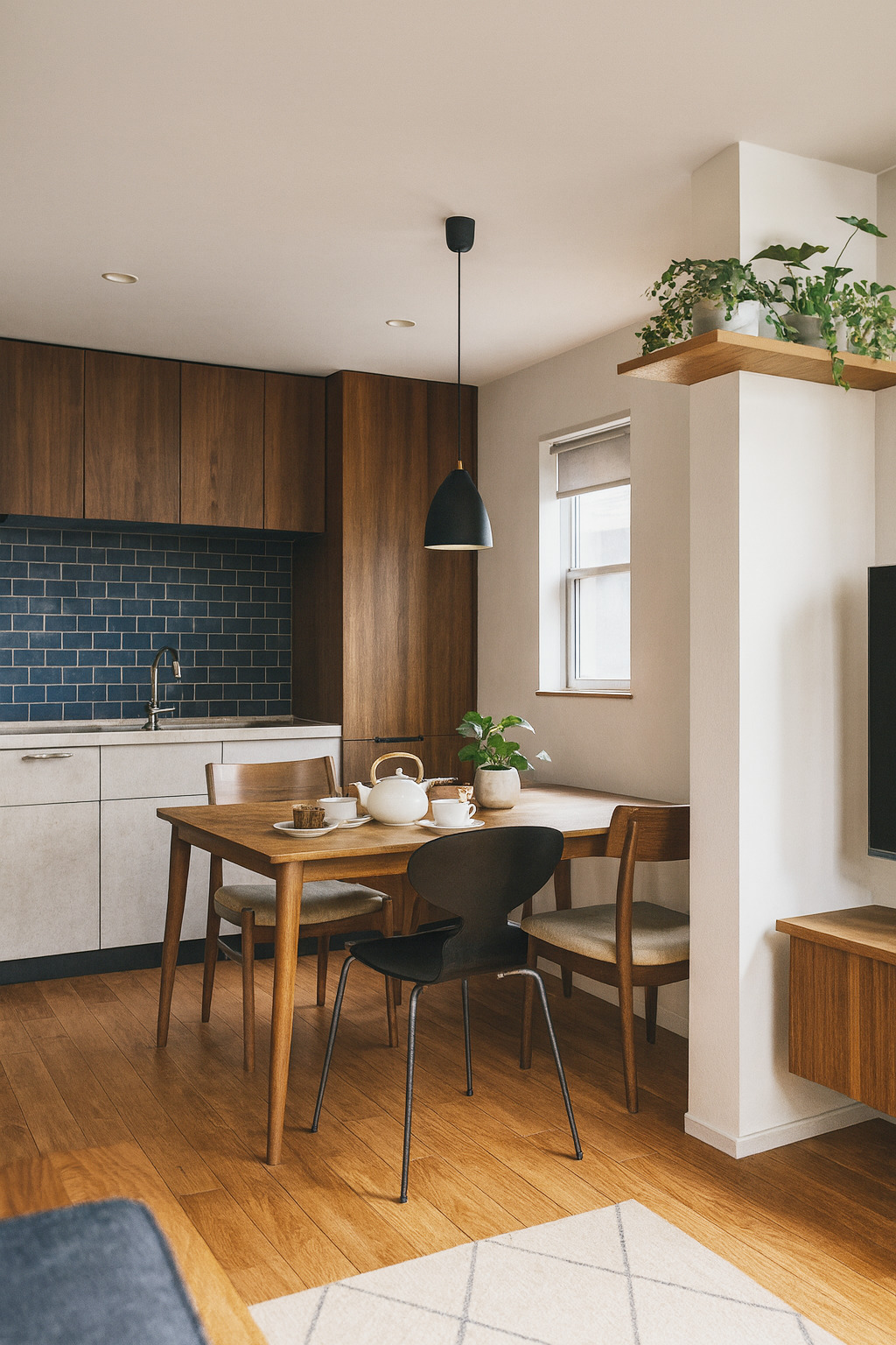 オーク×ウォールナットの床に、アクセントのネイビーを効かせたLDK。 家具・照明・タイルまでトータルで整えた統一感ある世界観は必見です。