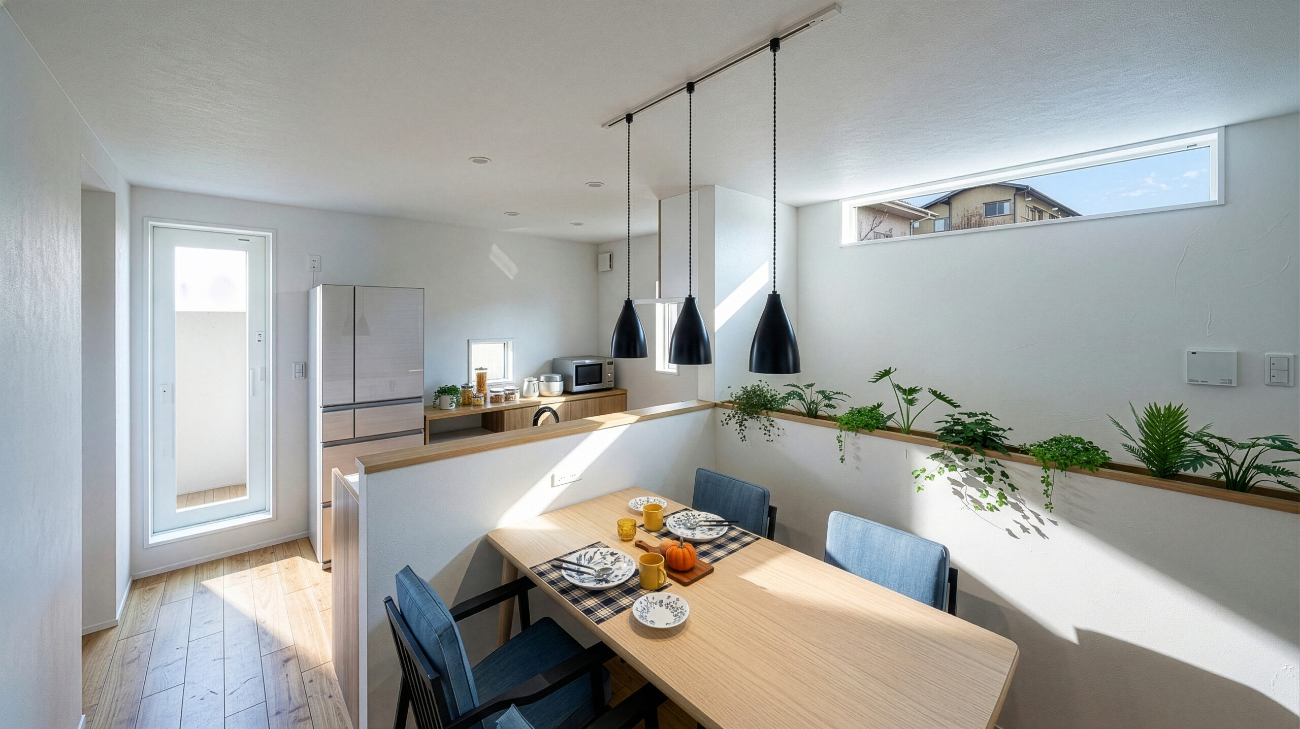採光を緻密に計算し、晴れた日は自然光だけで過ごせる明るい2階LDK。造作を活かして植栽の配置まで計画されており、室内にいながら自然植物と調和する暮らしを実現しました。日々を彩り、心まで整う心地よい空間です。(※画像はイメージです)