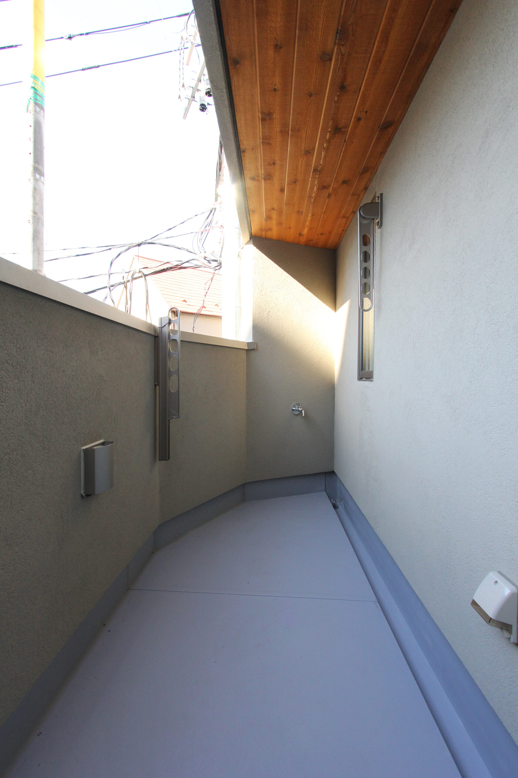 軒天には無垢のT&Gパネルをあしらい、バルコニーに出た時やふと見上げた瞬間に、木のやさしい質感が感じられるデザインに。エアコン室外機を置く屋上へのメンテナンス用ハシゴや、日々の家事を助ける外物干しも完備し、意匠性と長く住み継ぐための実用性を兼ね備えた空間となっています。