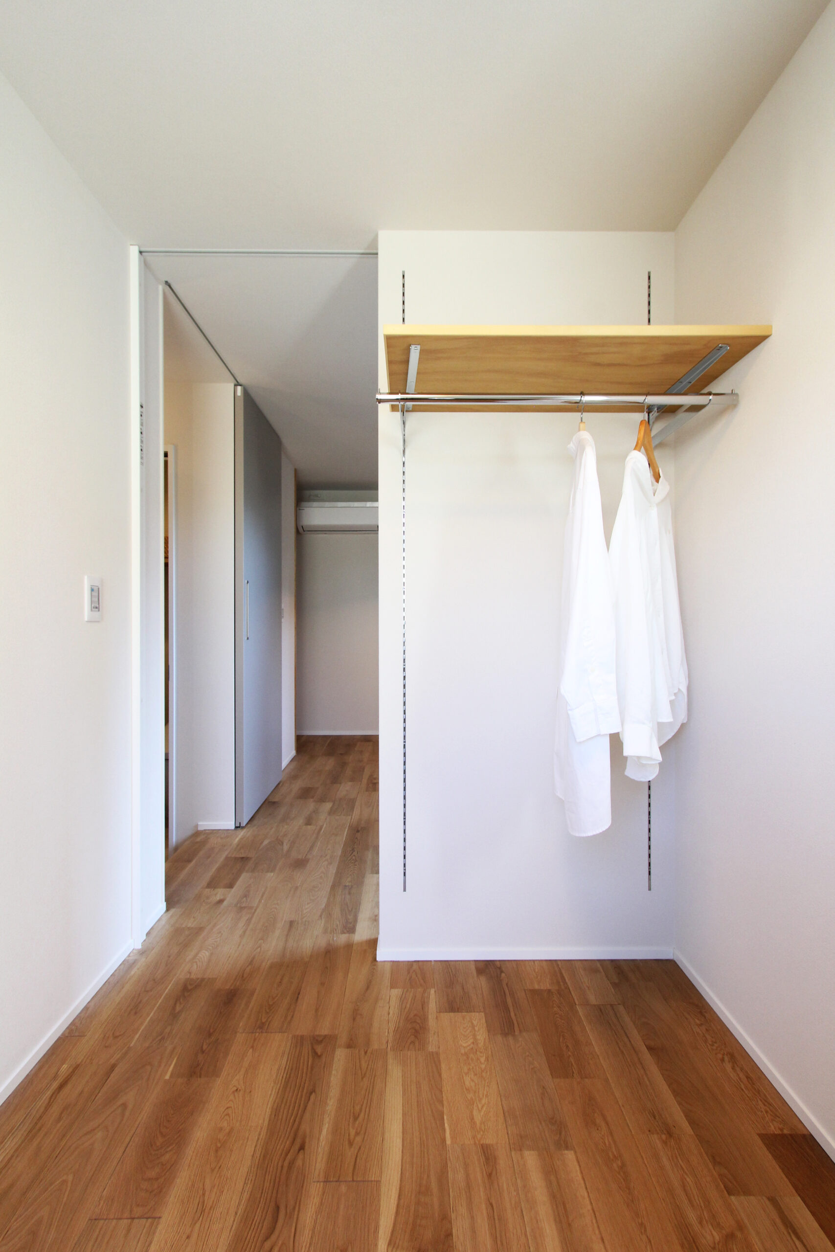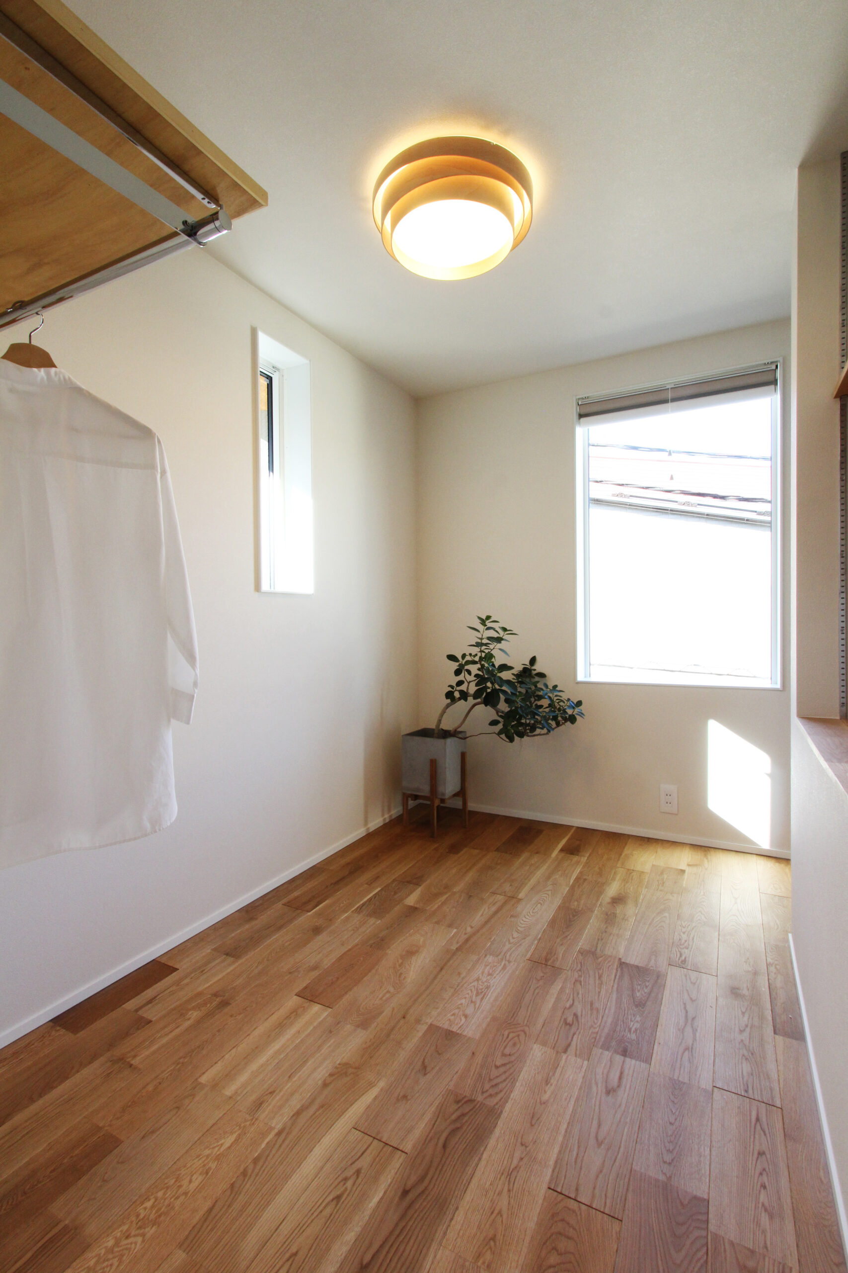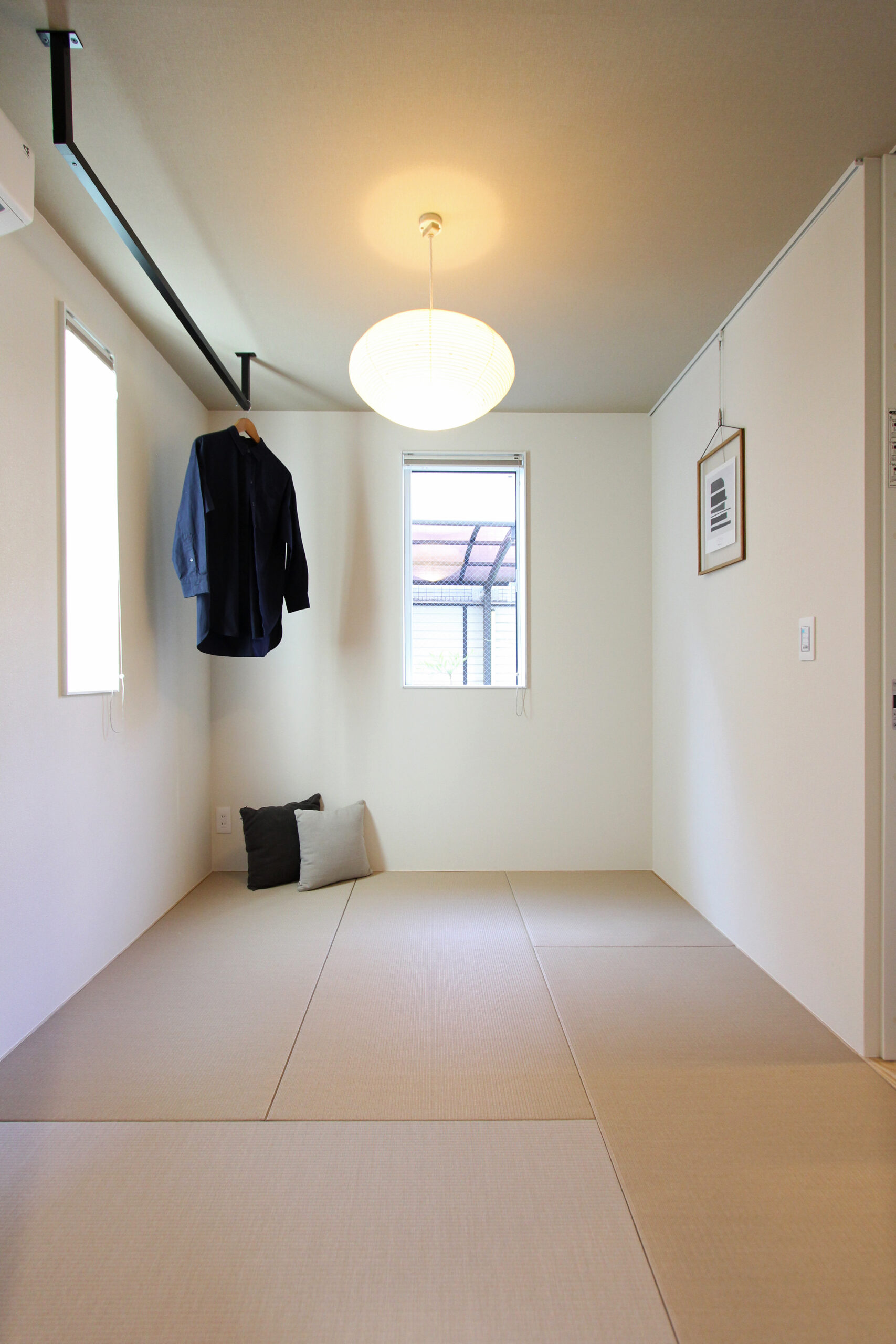 1階にはご夫婦の寝室となる3.5畳の和室と、約2畳のWICを配置。畳の下は基礎高を活かした床下収納とし、季節外の家電などを収められるように。天井クロスやプリーツスクリーンも畳に合わせてコーディネートし、掛け軸を飾るピクチャーレールを備えることで、まるで旅館の一室のような落ち着きのある空間に仕上がりました。 また、ドラム式洗濯機では乾燥できない衣類のために室内物干しも設置。情緒だけでなく、実用性もしっかりと確保しています。