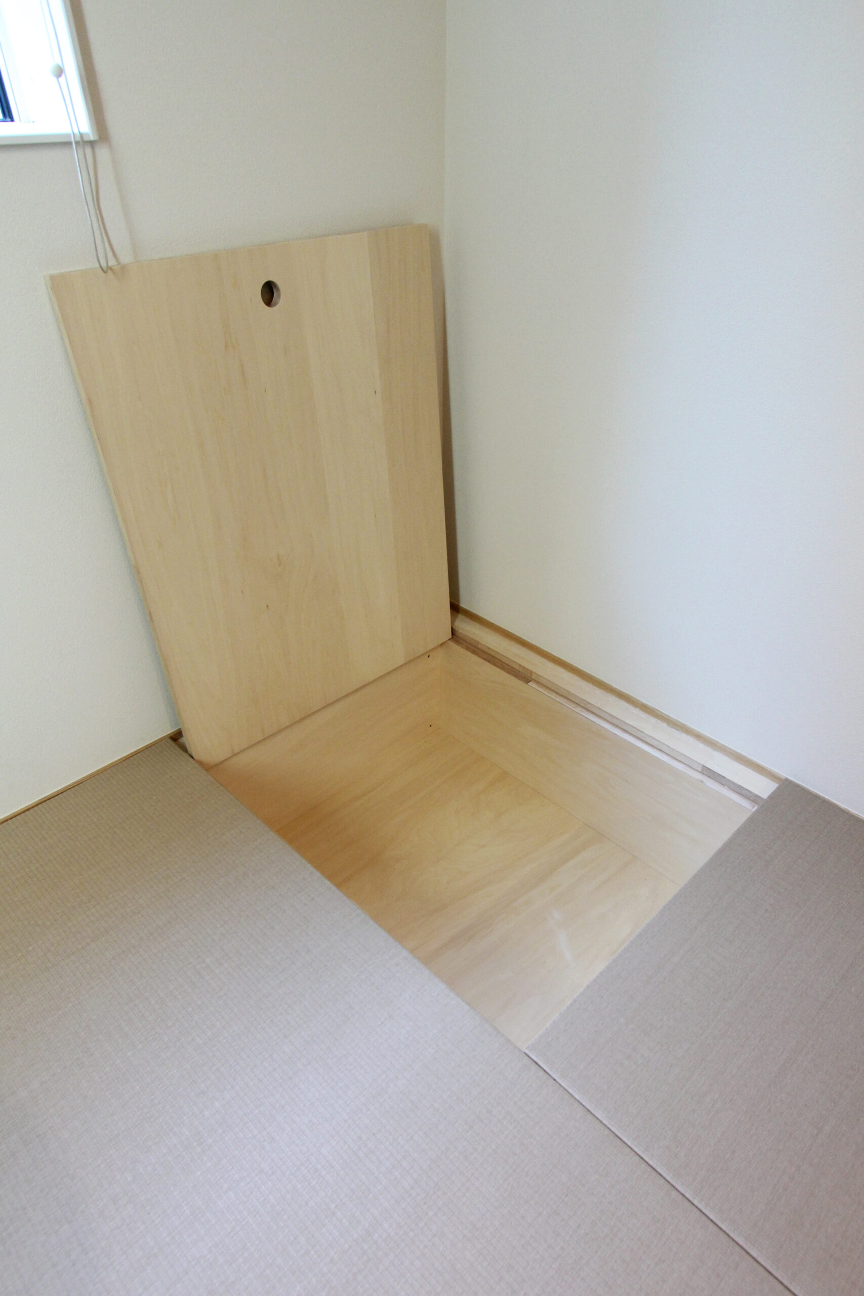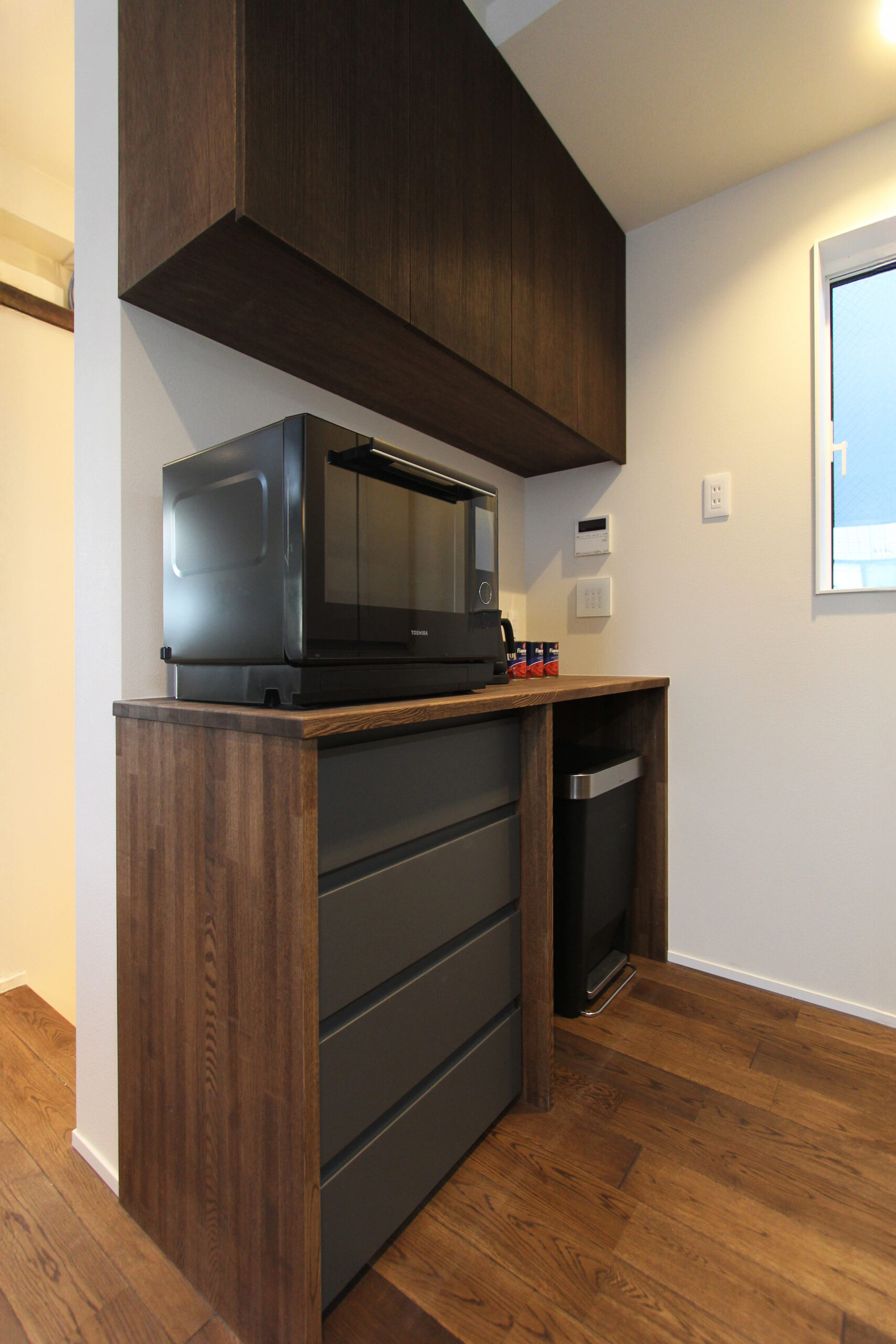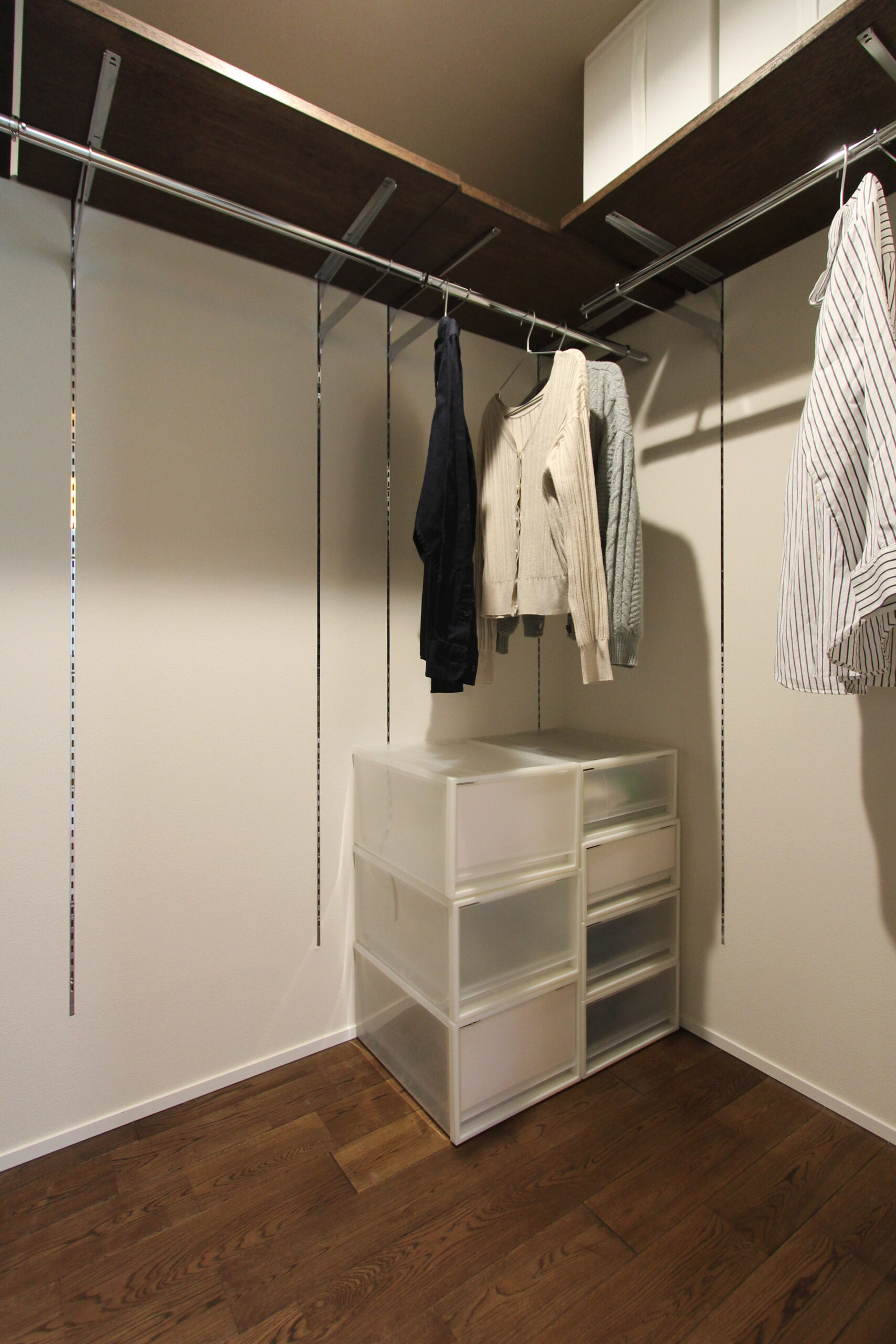1階にはご夫婦の寝室となる3.5畳の和室と、約2畳のWICを配置。畳の下は基礎高を活かした床下収納とし、季節外の家電などを収められるように。天井クロスやプリーツスクリーンも畳に合わせてコーディネートし、掛け軸を飾るピクチャーレールを備えることで、まるで旅館の一室のような落ち着きのある空間に仕上がりました。 また、ドラム式洗濯機では乾燥できない衣類のために室内物干しも設置。情緒だけでなく、実用性もしっかりと確保しています。