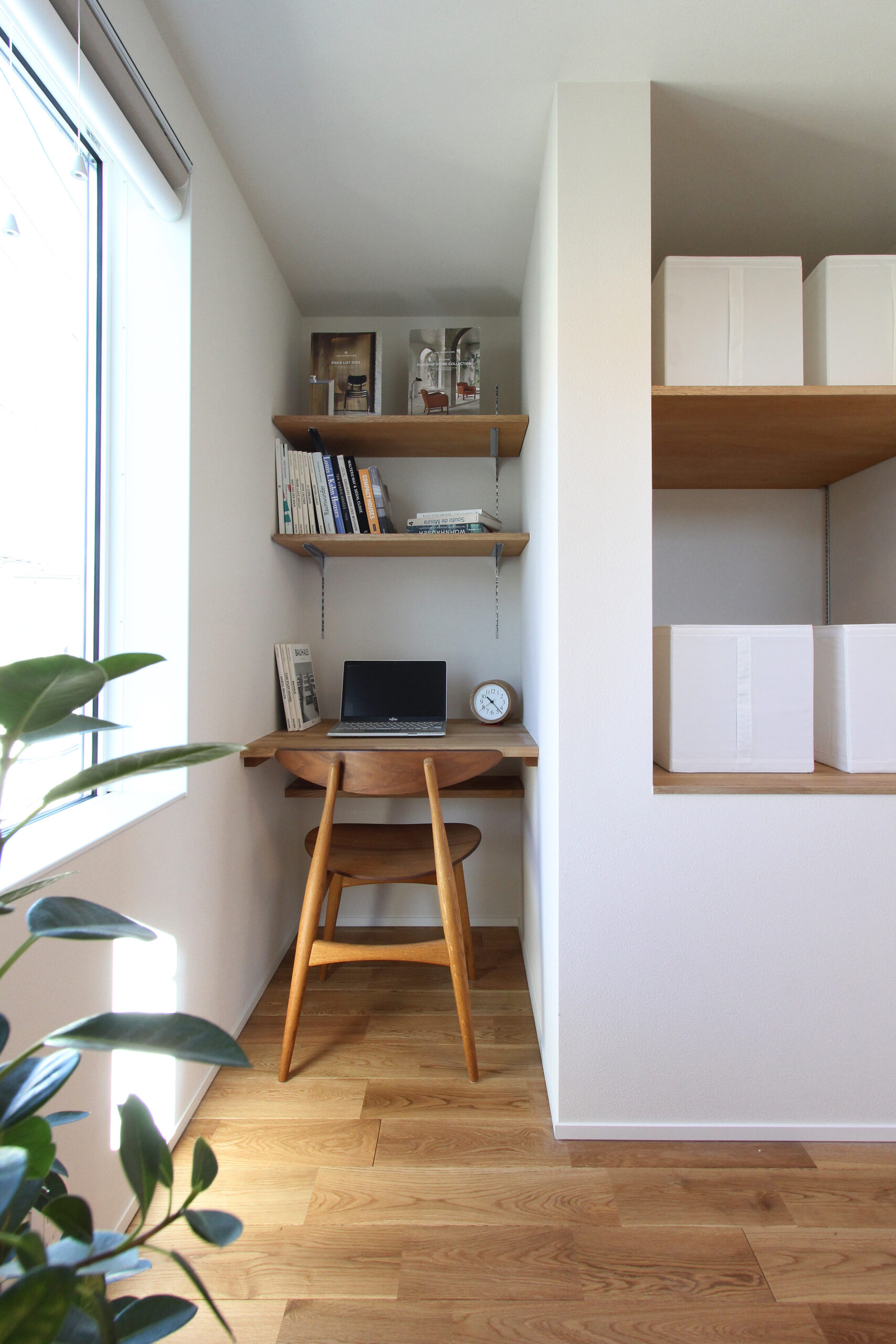 現在はご主人のワークスペースとして、仕事に集中できる静かな環境を確保しました。壁面には有孔ボードを備え、お気に入りの帽子やバッグをディスプレイするように収納できる遊び心をプラス。将来、ライフスタイルが変わった際にも柔軟に用途を変えられるよう、シンプルで使い勝手の良い設計を心がけました。