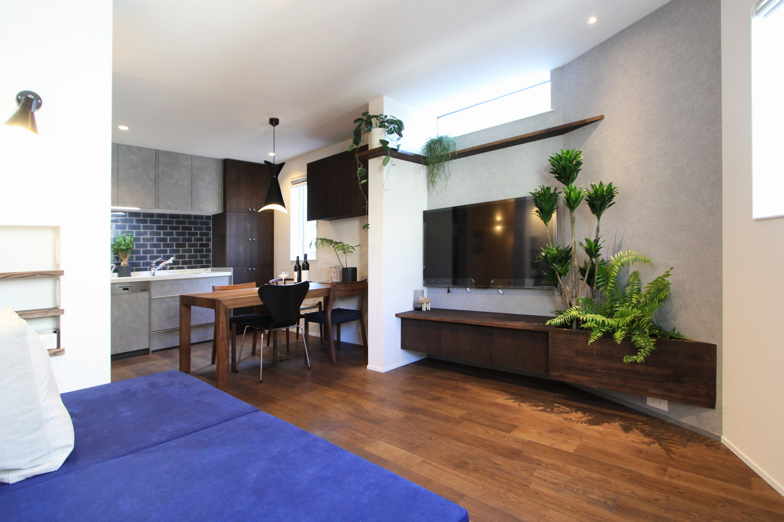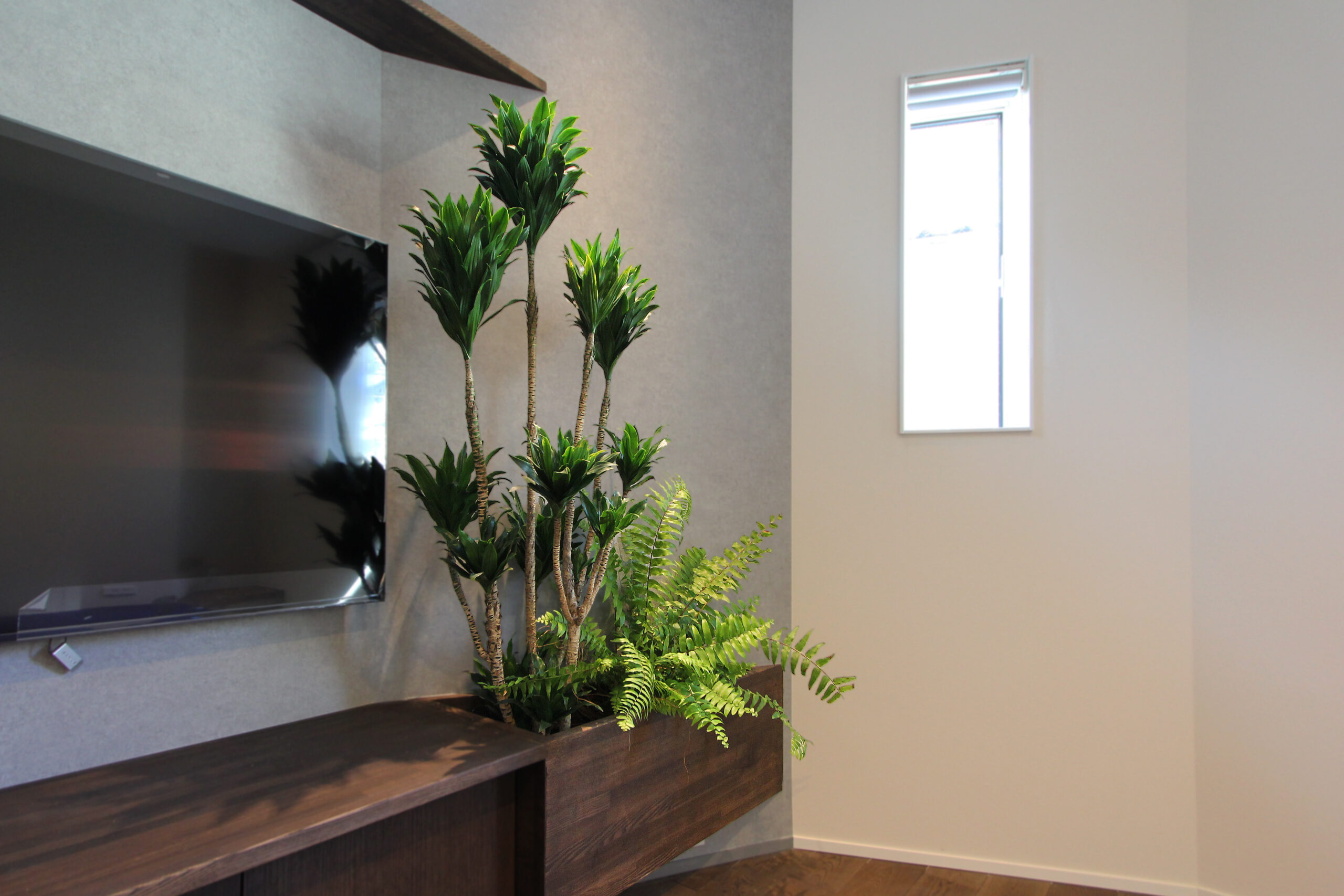 テレビボードと一体となる植栽スペースには、「すっきりとしたシルエットの植物を」というお施主様のご要望を受け、ドラセナコンパクタを採用しました。 背景となるグレーの壁面に、濃い緑の葉色が鮮やかに映える品種をセレクト。シックな色合わせが空間全体を引き締め、ご夫婦が大切にされている「和モダン」の趣きをより一層深めています。