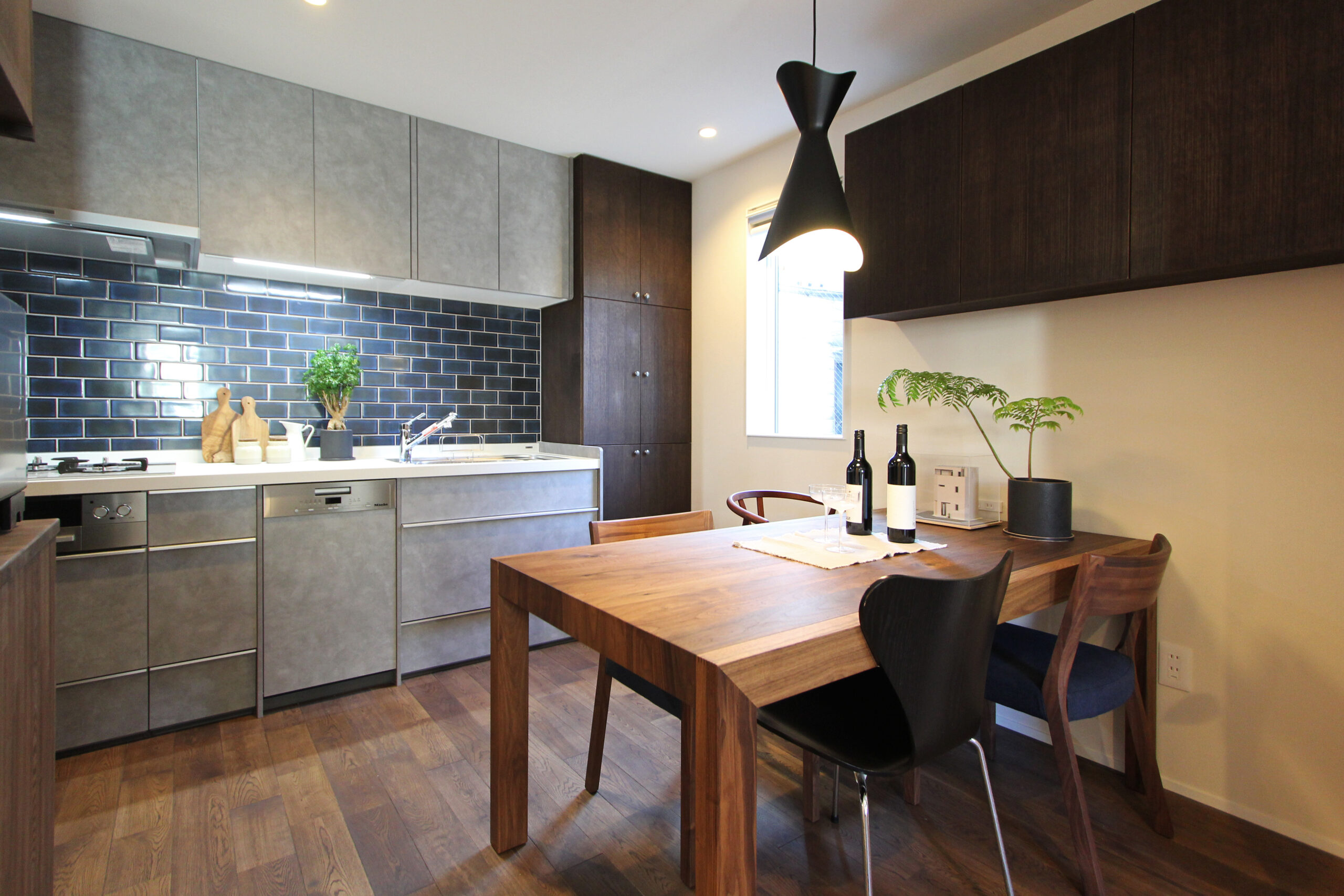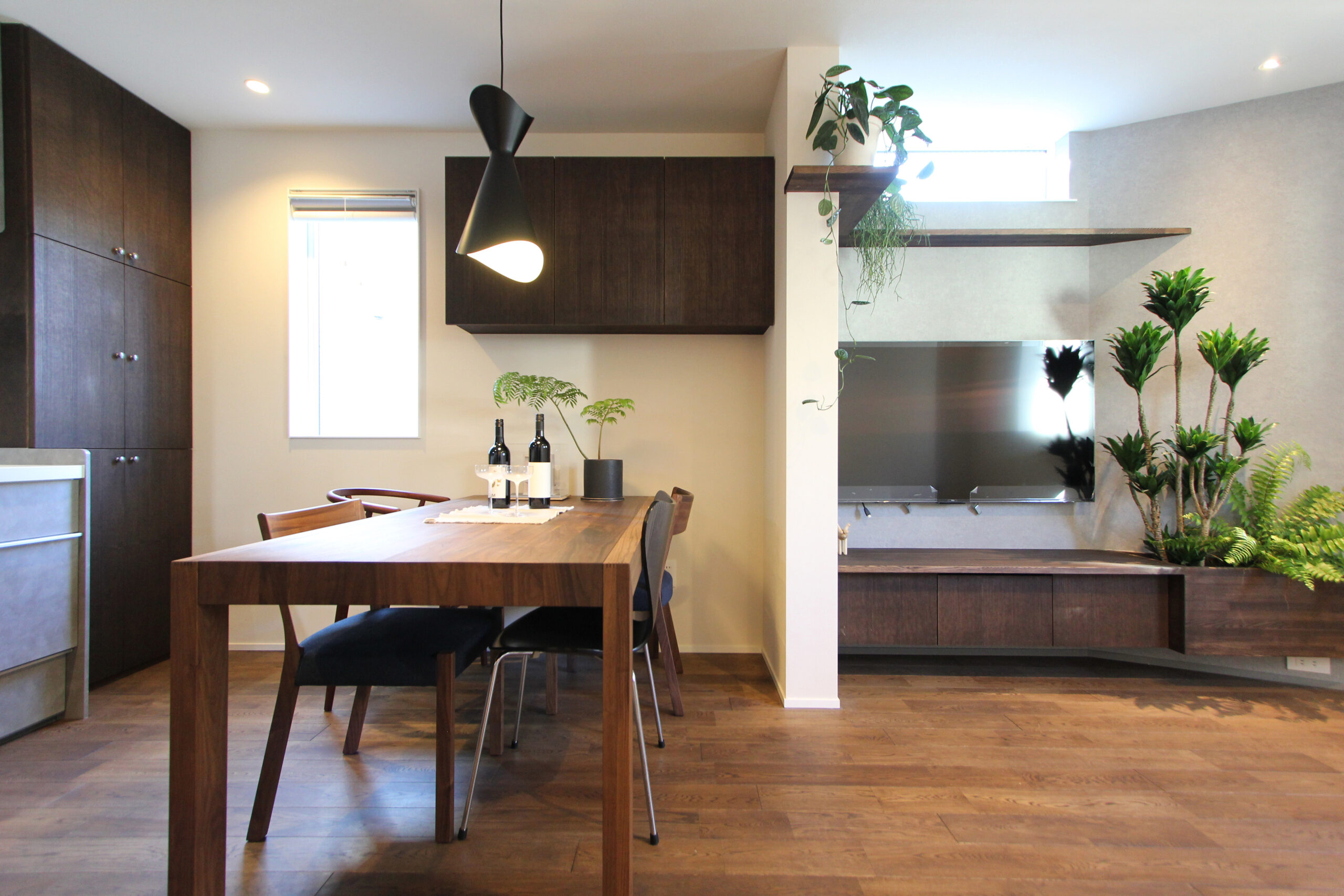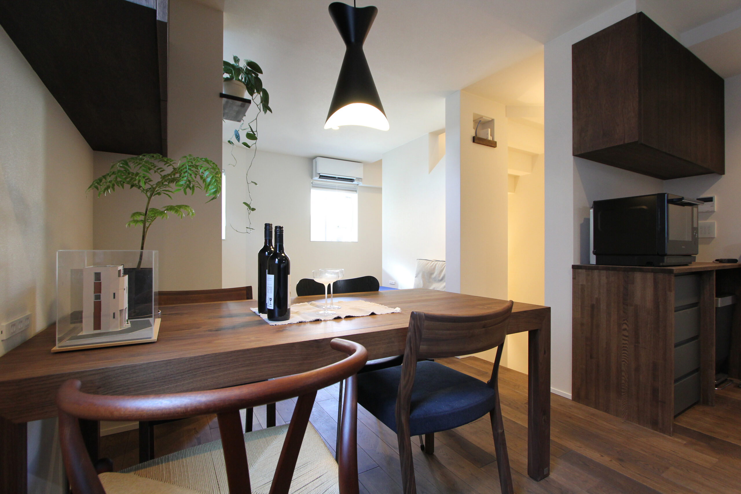 ダイニングには、計画当初から導入を決めていた「HIRASHIMA」のテーブル(CARAMELLA)と「NINOTCHKA」のペンダントライトを配置。お気に入りの家具を中心に、それらが最も美しく見えるバランスで空間を設計しました。フローリングにはオーク材にウォールナット塗装を施し、深みのある落ち着いた空気感を演出しています。
