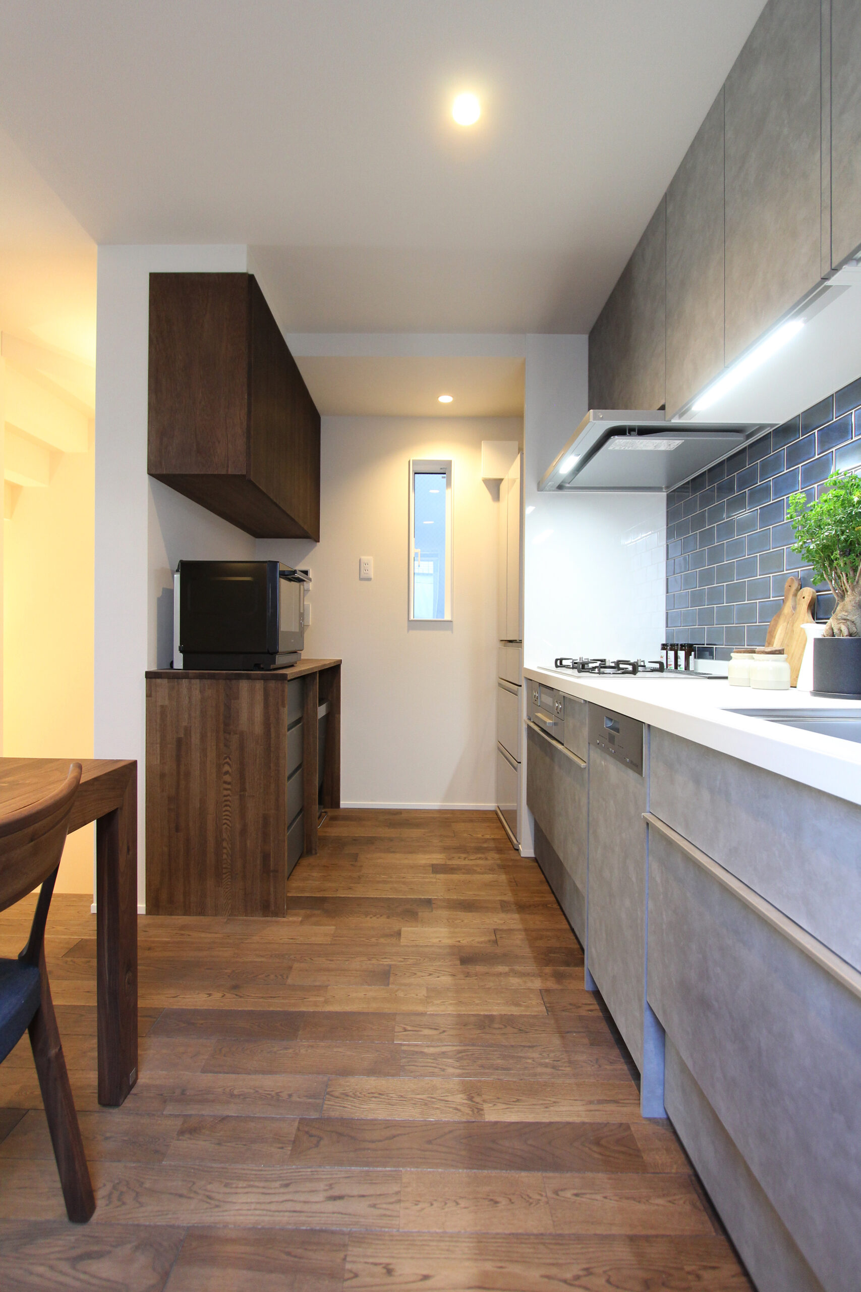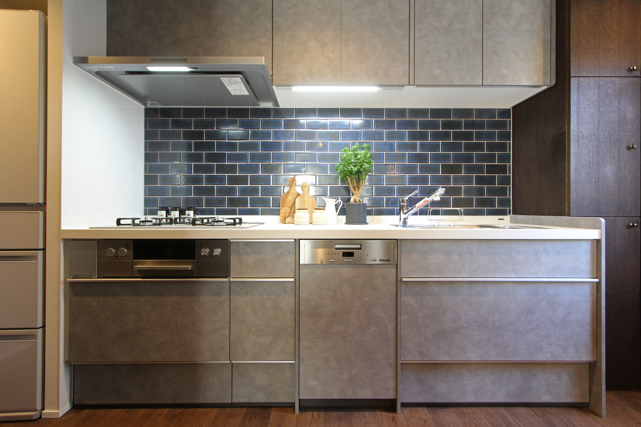 キッチン本体はLIXILの「ノクト」を採用。背面収納は造作棚とIKEAの引き出しを組み合わせ、デザインと機能性を両立しました。キッチンタイルのブルーをリビングのソファとリンクさせるなど、色使いを統一することで、LDK全体に心地よい一体感を生み出しています。
