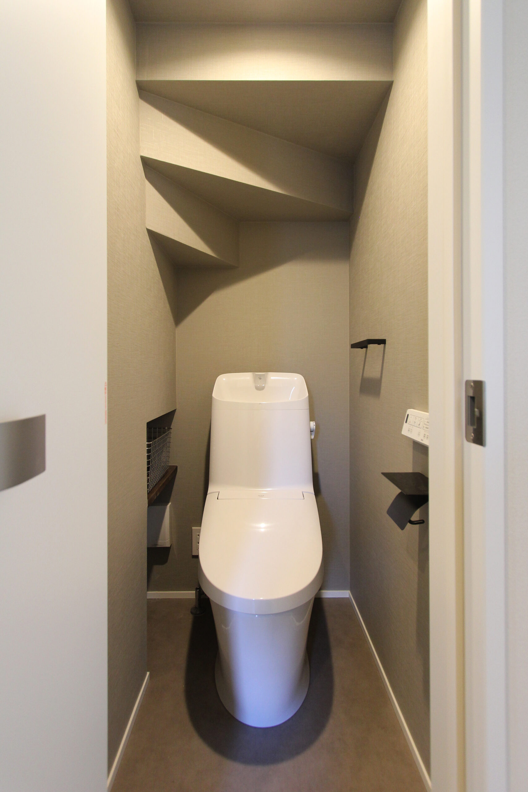 階段下の空間を利用した1階トイレは、コンパクトだからこそ落ち着く「おこもり感」を大切にしました。 隣接する和室の雰囲気に合わせ、織物調のクロスを選定してしっとりと落ち着いた内装に。壁面の大きなニッチ収納はお施主様のアイデアによるもので、トイレットペーパーをパッケージのまま収納できるサイズに設計されています。