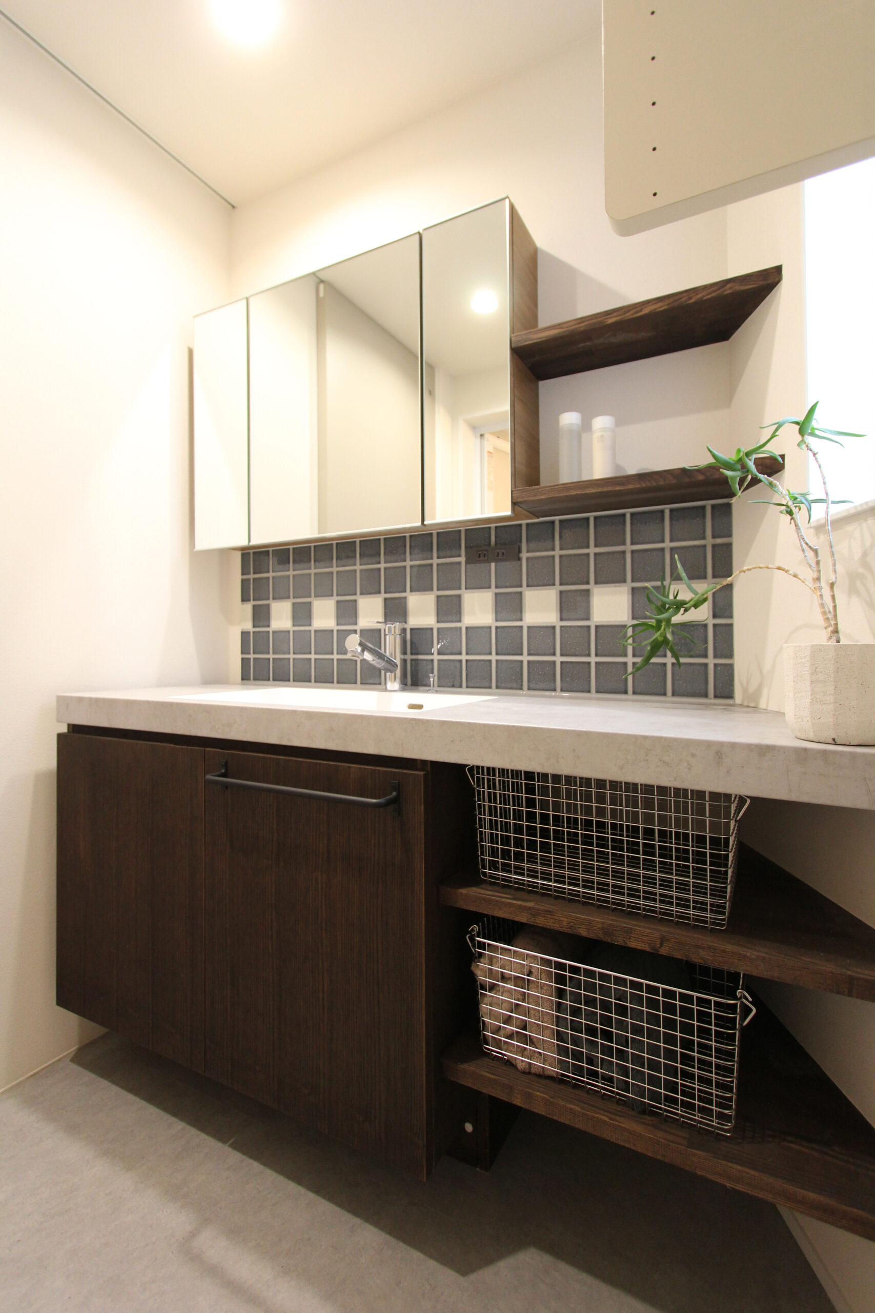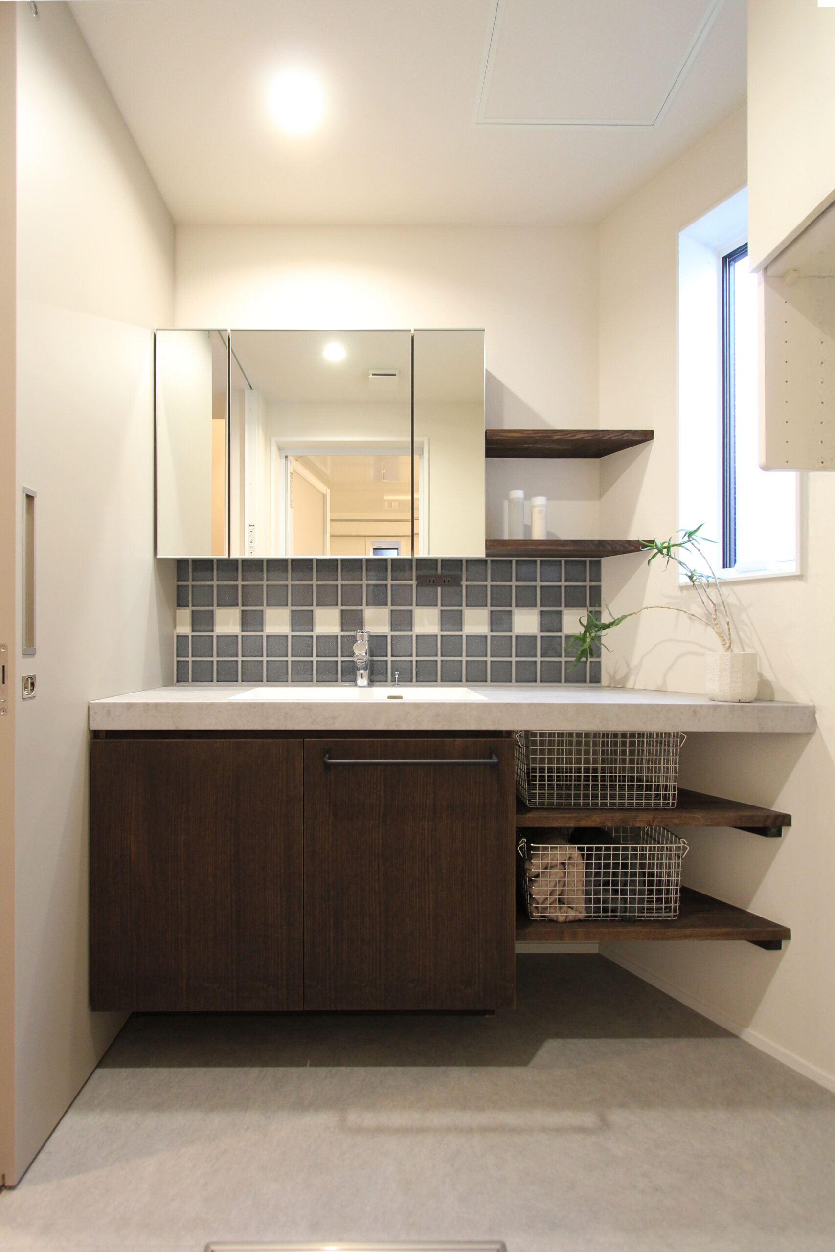 アイカのスタイリッシュカウンターを採用した造作洗面台。 壁面のタイルは、職人さんと相談しながら決めたこだわりの貼り方で、お施主様お気に入りのデザインを実現しました。 洗濯機の上部には南海プライウッドの吊り戸棚を設置。ハンガーを掛けられるパイプ付きで、洗濯に必要な作業をこの場所でスムーズに完結できます。浴室はLIXILの「リデア」を選び、明るく温かみのあるカラーで一日の疲れを癒やす空間としました。
