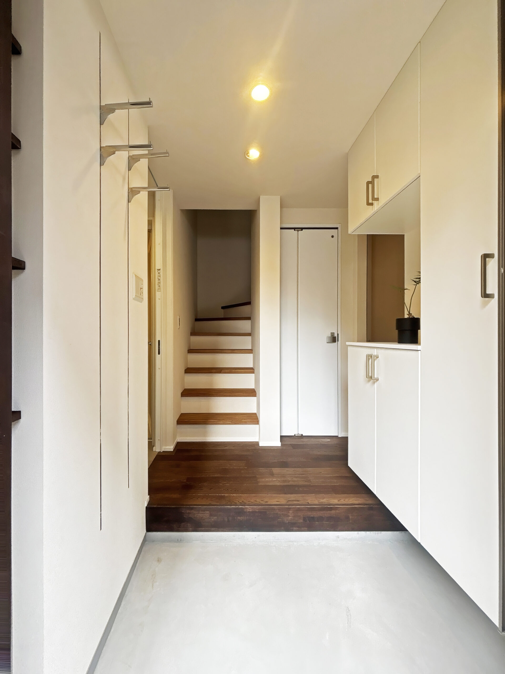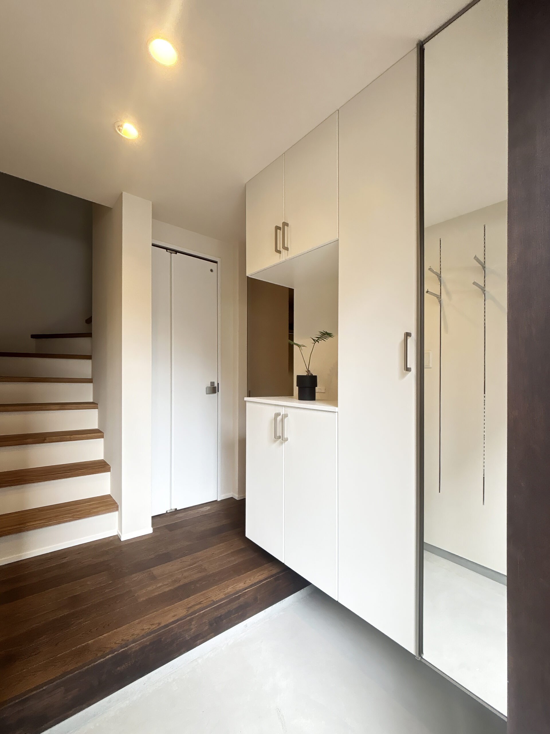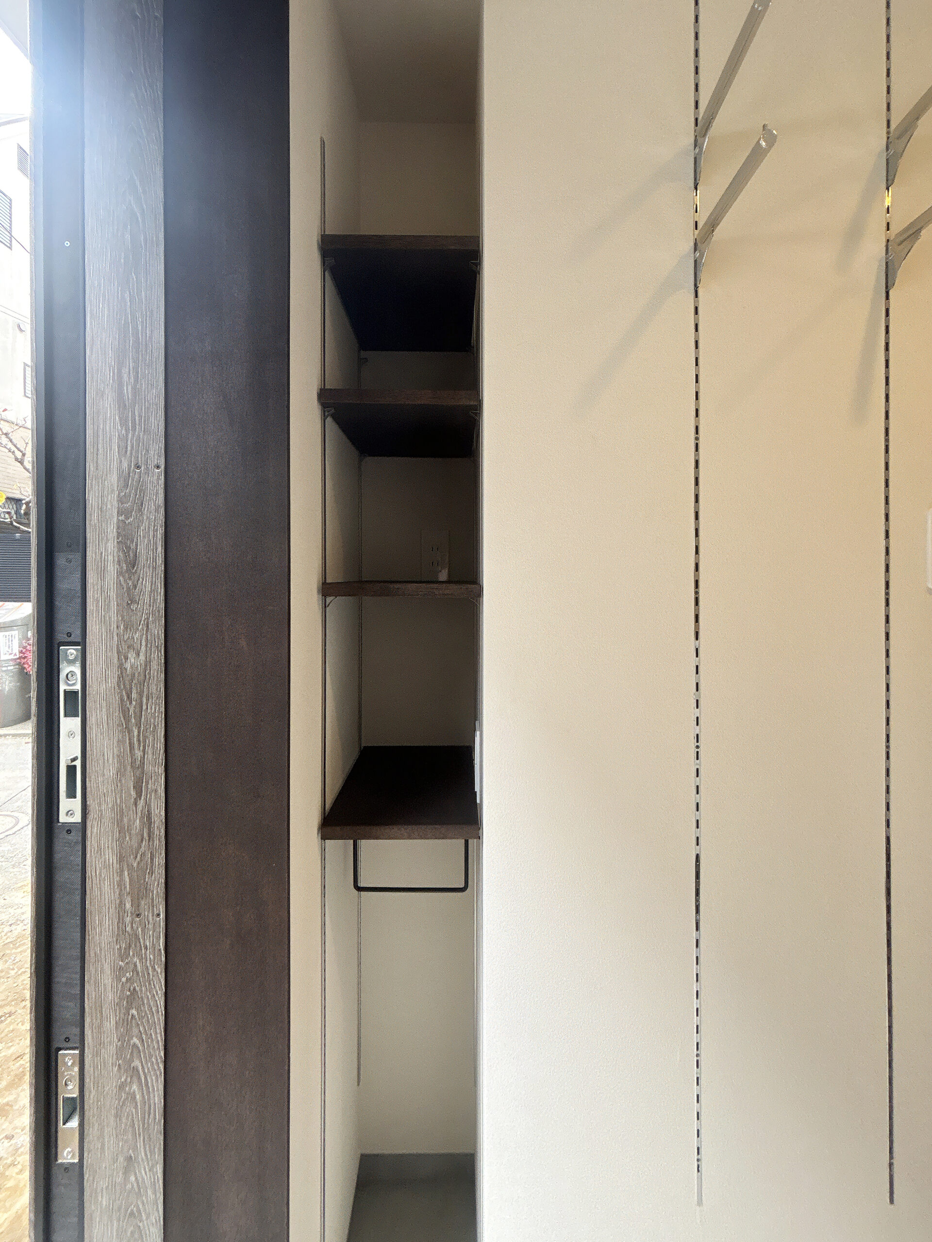 玄関を入って右側にはLIXILの玄関収納を設置し、普段使いの靴をすっきりと整理。 一方、設計上デッドスペースとなりがちな左側の空間も見逃さず、可動棚を設けました。ここには傘やヘルメットなど、意外と置き場所に困るアイテムを収納。わずかな隙間も無駄にせず、暮らしやすさに還元しています。