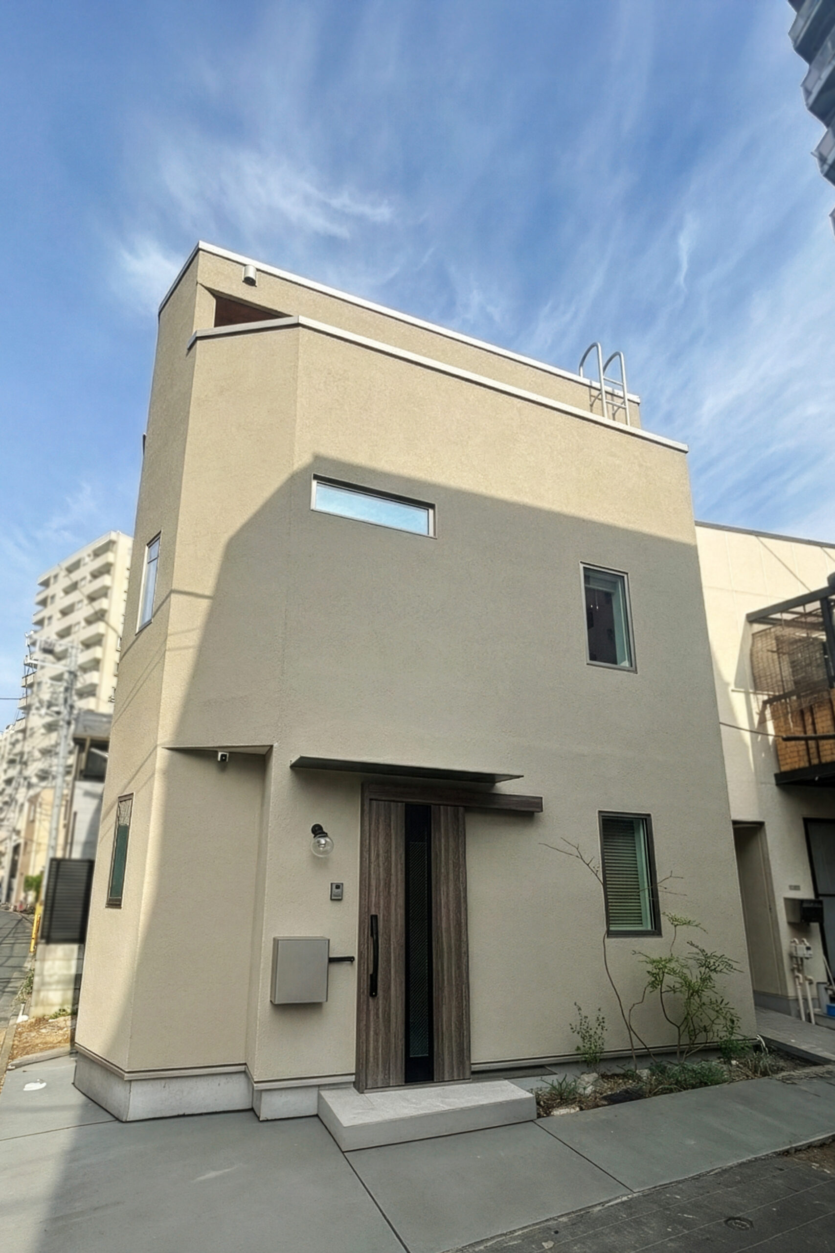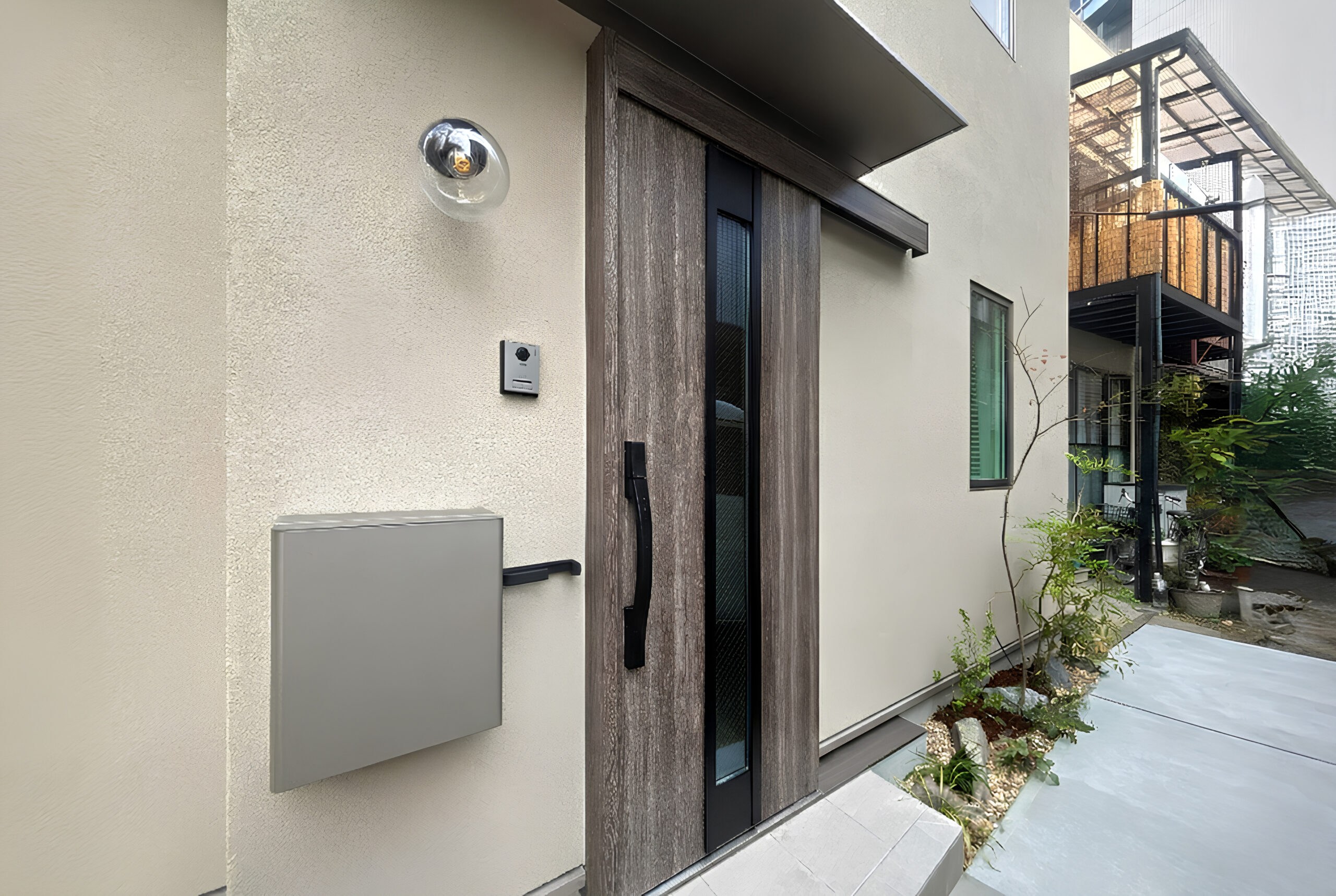 道路境界線が2方向にあるため、街ゆく人々の視線が自然と集まる立地。そこで、外壁には職人の手仕事が感じられる塗り壁材「Soi(ソーイ)」を採用しました。 カラーはアースの施工事例として初となるアイボリー系の「ムーンダスト」を選定。仕上げ方も通常のラフ仕上げではなく「クラシックサンド仕上げ」にすることで、より繊細で上品な表情を演出しています。 足元にはご主人のこだわりである和モダンな植栽をあしらい、建物と緑が調和した、温かみのある佇まいとなりました。