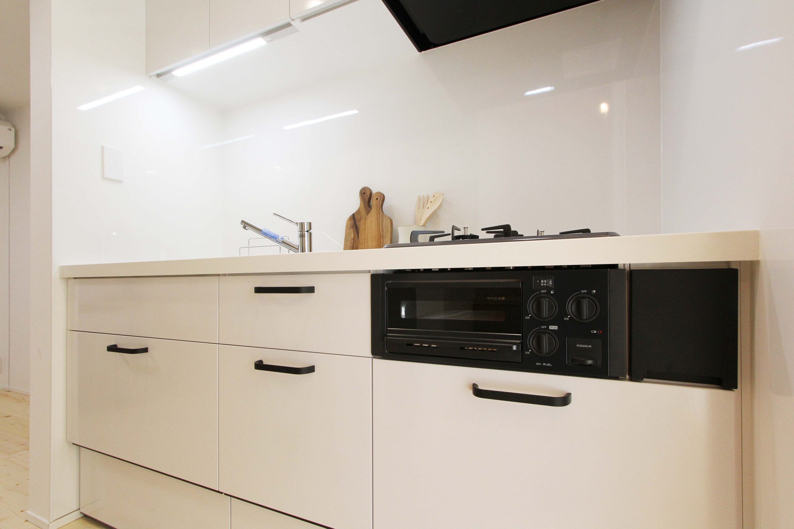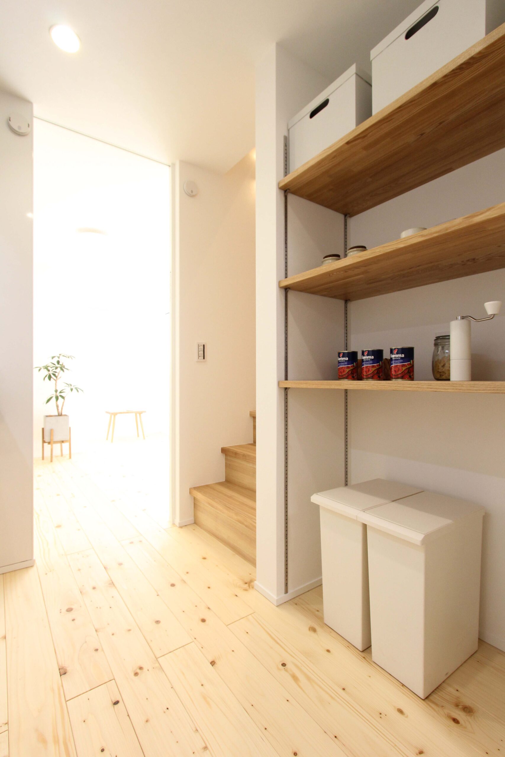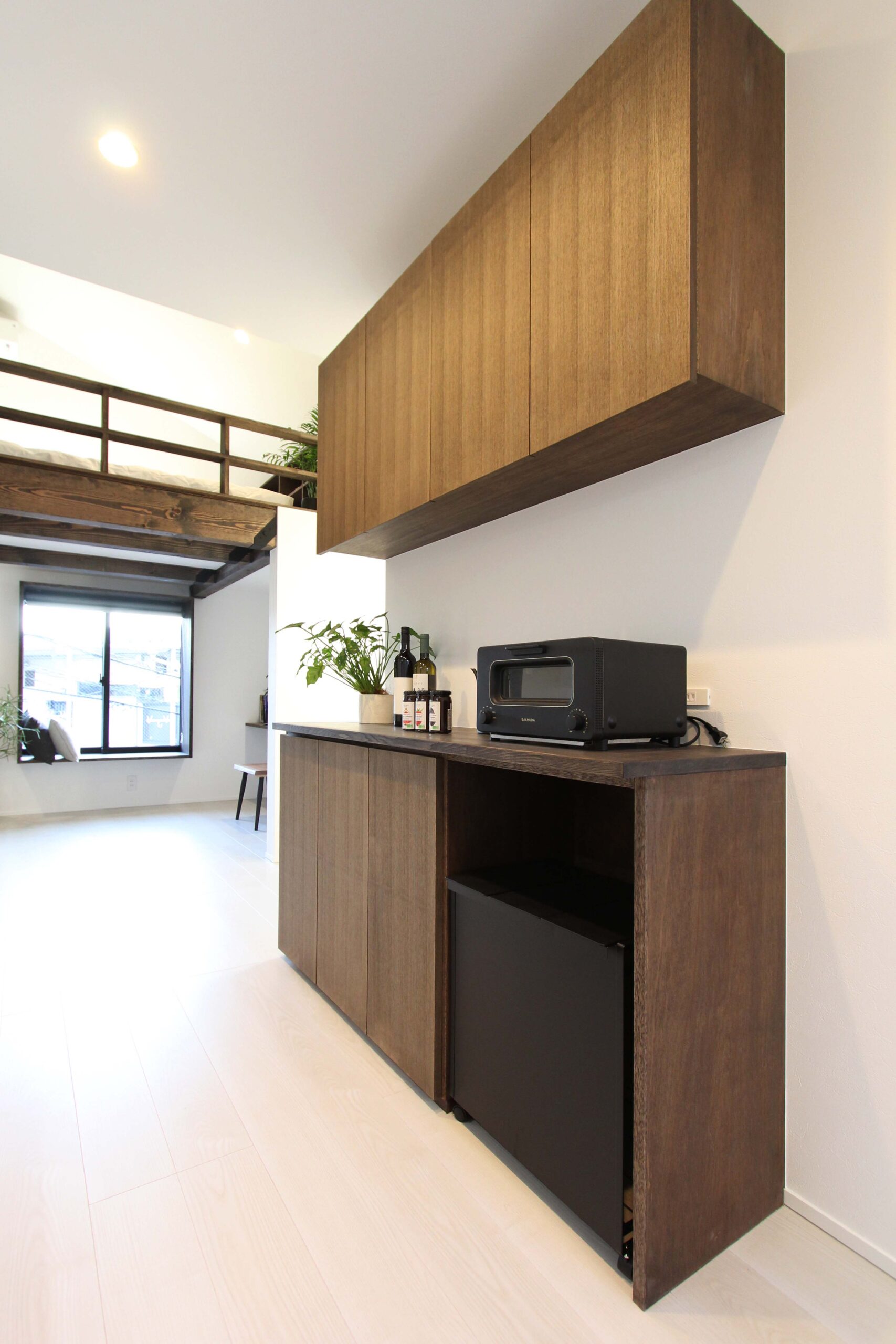 空間を広くゆったりと使うために、あえてコンパクトなキッチンを選びました。背面の造作収納は、お手持ちのゴミ箱が一番下の段にぴったり収まるよう、設計段階から計算しています。可動棚も備えているため、飾るものに合わせて高さを変えながら、自分らしく整えられる仕様です。
