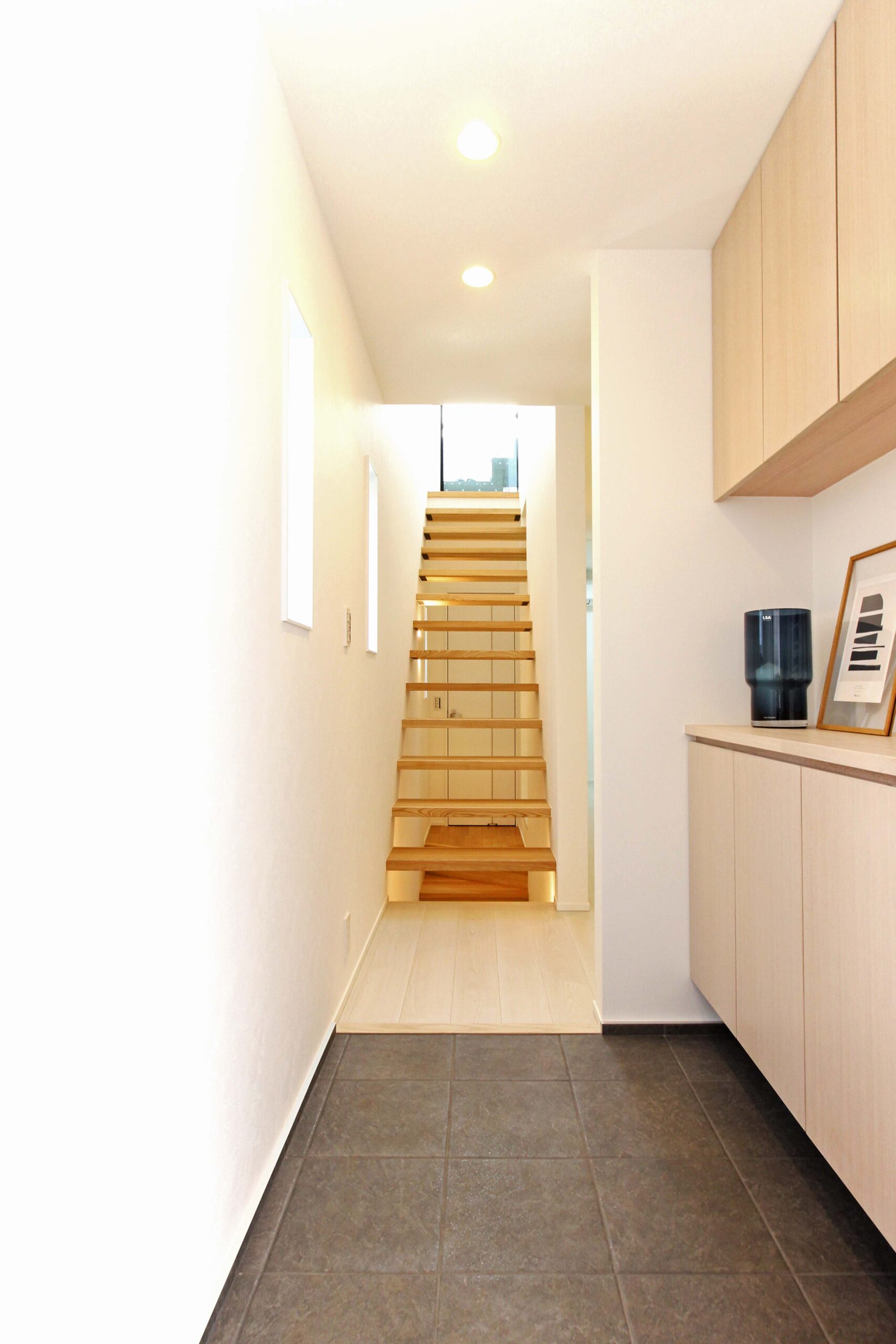 視線が抜けるデザインを採用し、家の中心に明るさと開放感をもたらす階段です。美しい木目を活かしながら、段差にはさりげなく滑り止めのラインを施し、お子様も安心して上り下りできるよう配慮しました。玄関を開けた瞬間に、空間の広がりを感じさせてくれる大切なポイントです。