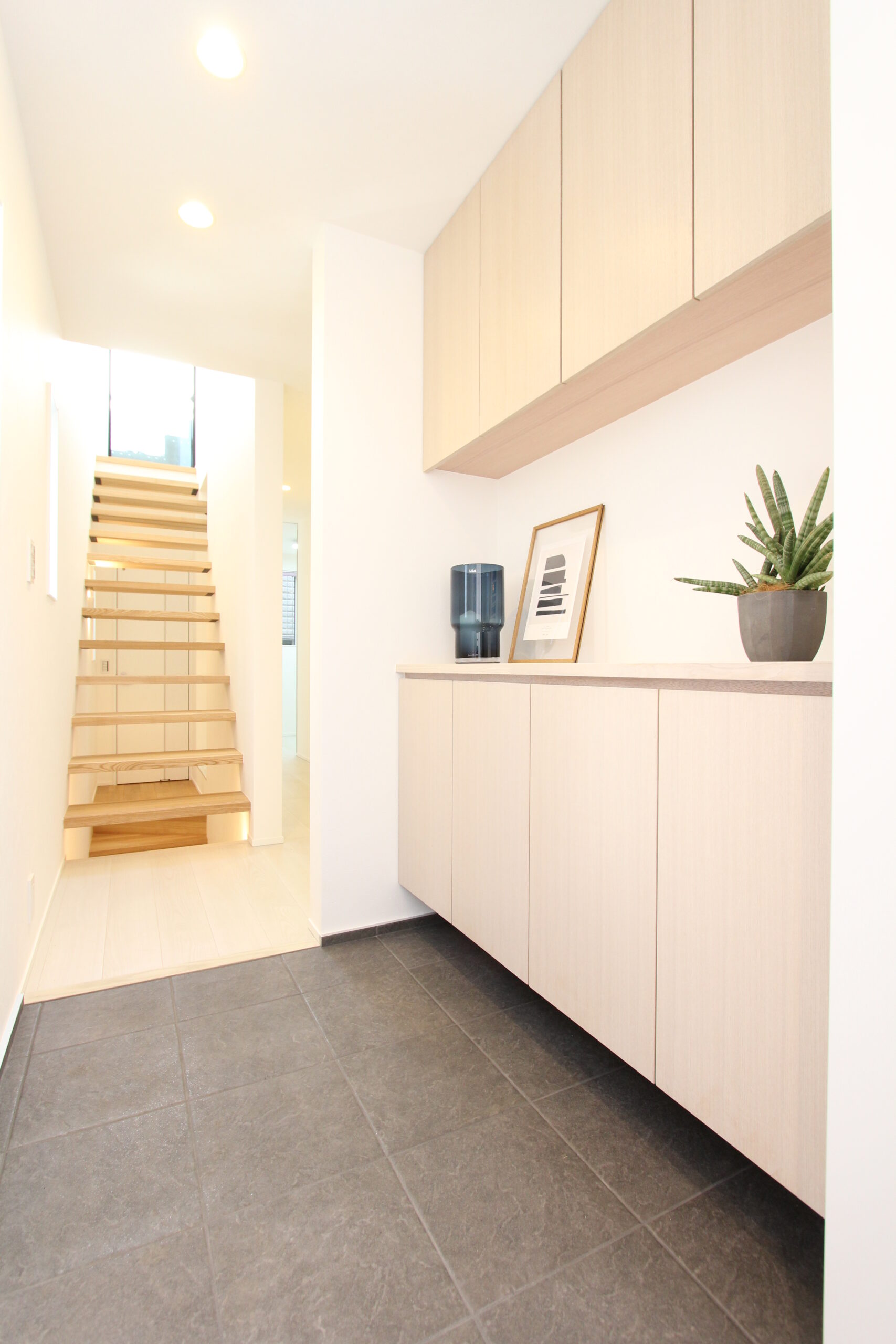 二世帯が心地よく集まる玄関には、ゆとりのある土間空間を設けました。足元に空間を作った造作のシューズボックスが、圧迫感を抑えて軽やかな印象を与えてくれます。また、室内への段差をなくしたフラットな設計により、家族みんなが毎日スムーズに、安心して出入りできる住まいです。
