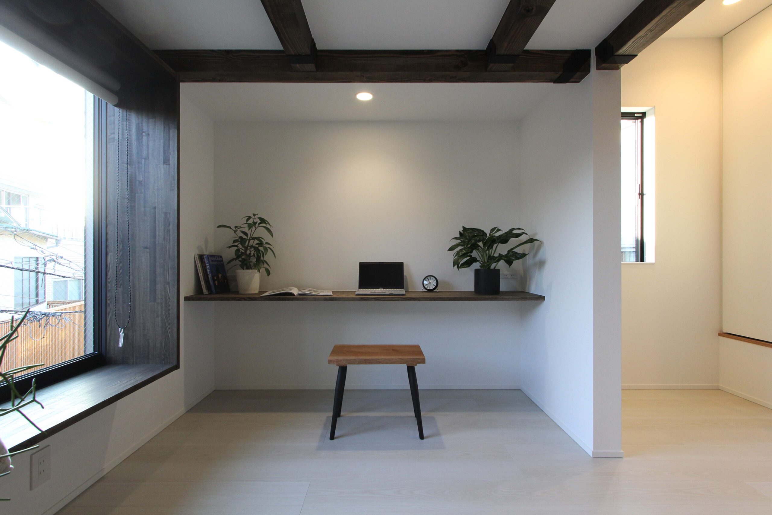 テレビスペースの正面に、デスクを造り付けたワークスペースを設けました。くつろぎの場と背中合わせに配置することで、同じ空間にいながら自然と気持ちを切り替えられる設計です。リビングの落ち着いた雰囲気はそのままに、家事の合間やリモートワークにも集中できる、現代の暮らしに寄り添った場所になりました。