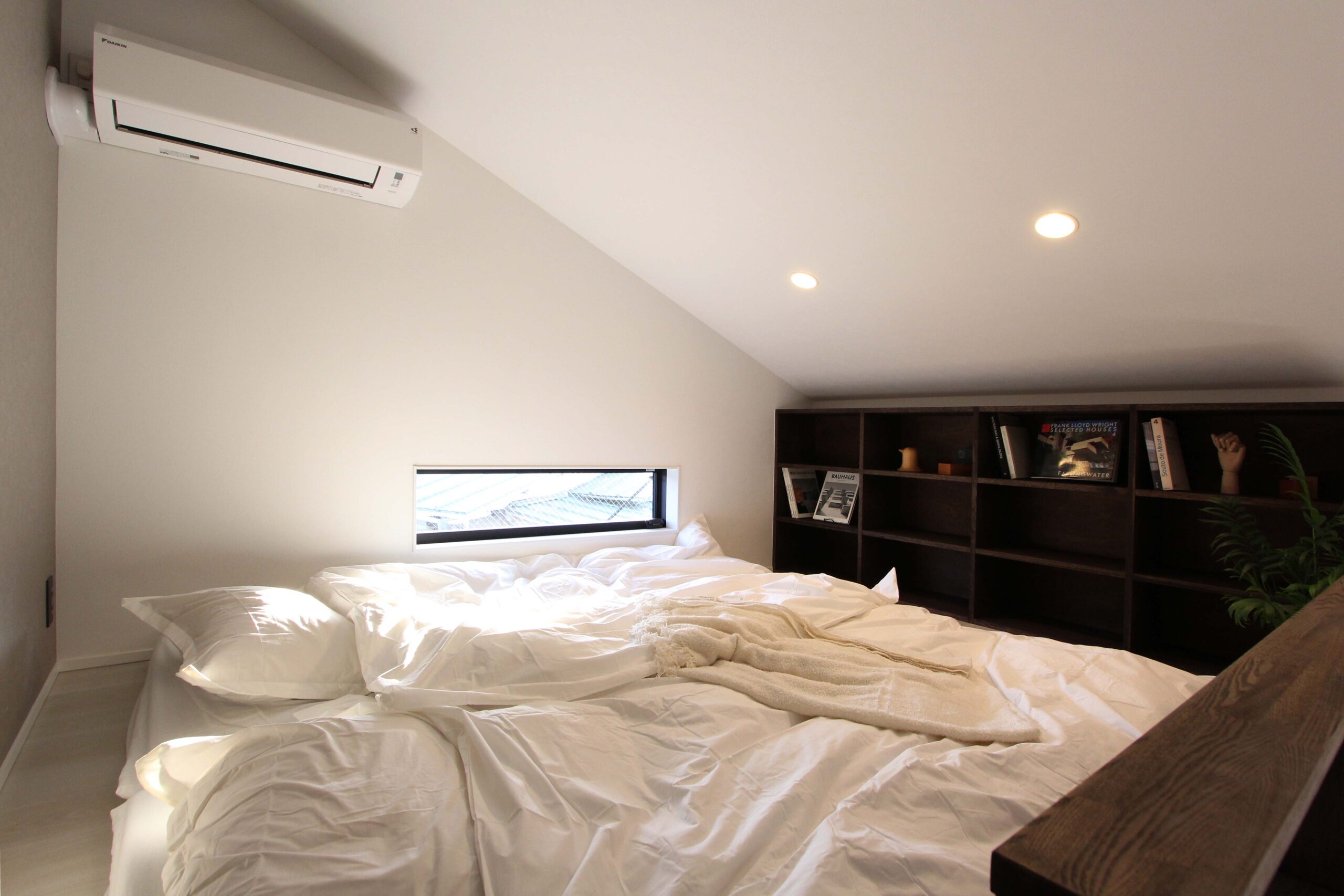 ご夫婦の寝室となるロフトは、造作家具の色味を全体と合わせることで、一体感のある落ち着いた雰囲気に仕上げました。緻密な空気の通り道の設計により、エアコン1台だけでフロア全体が心地よい温度に保たれます。デザインの美しさだけでなく、確かな性能で日々の眠りを支える空間です。