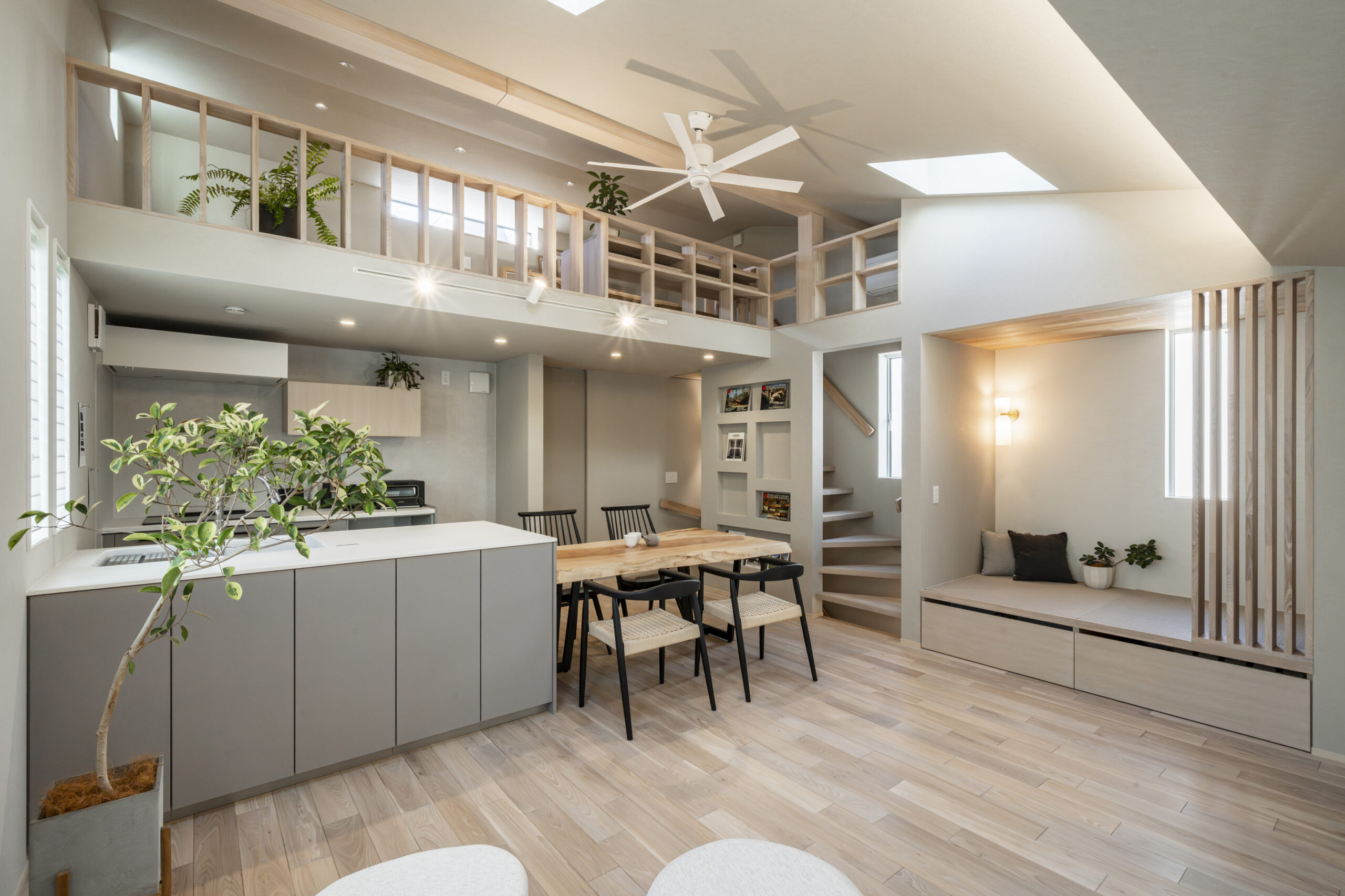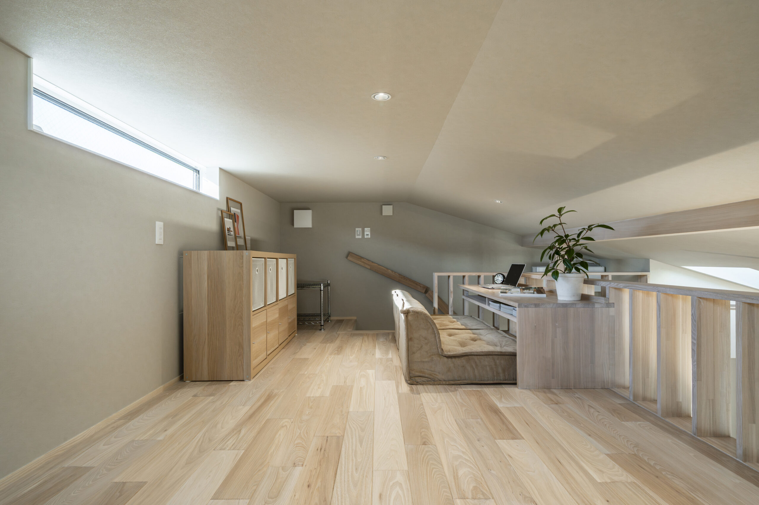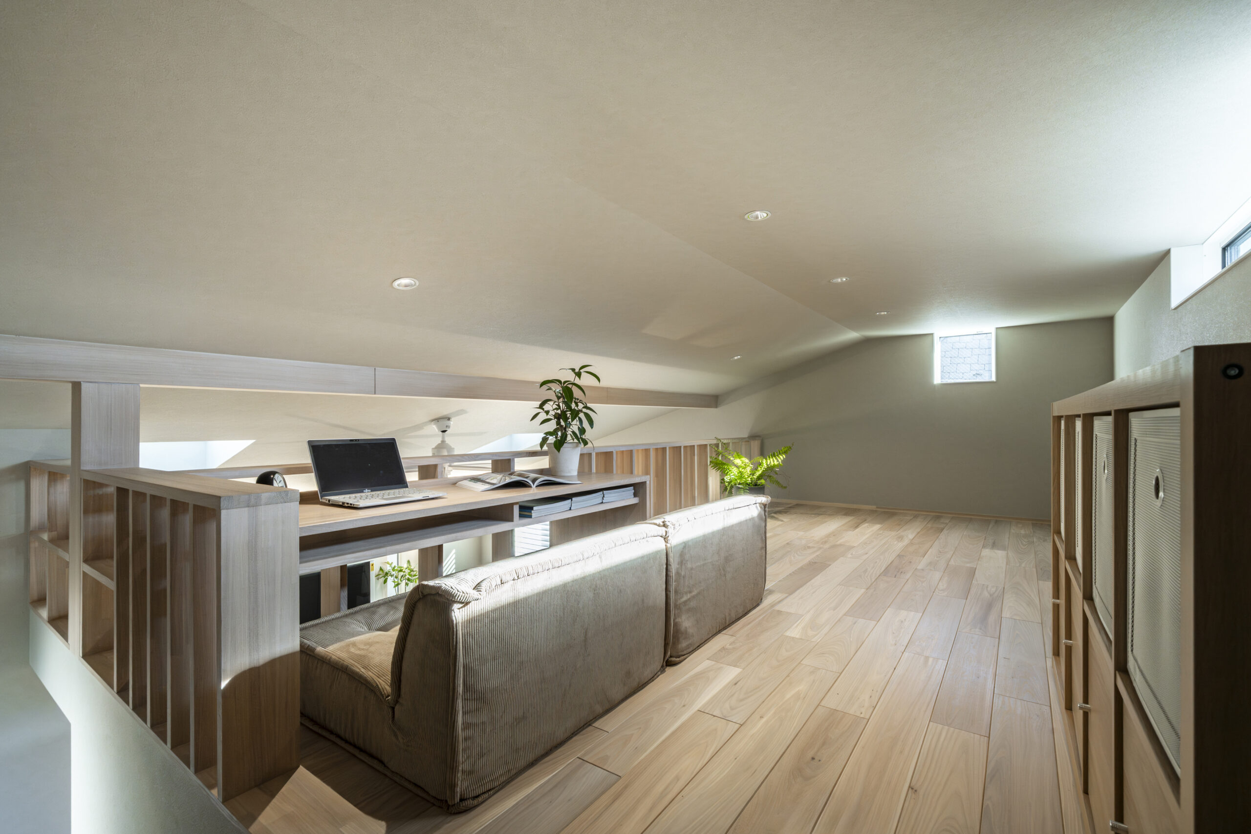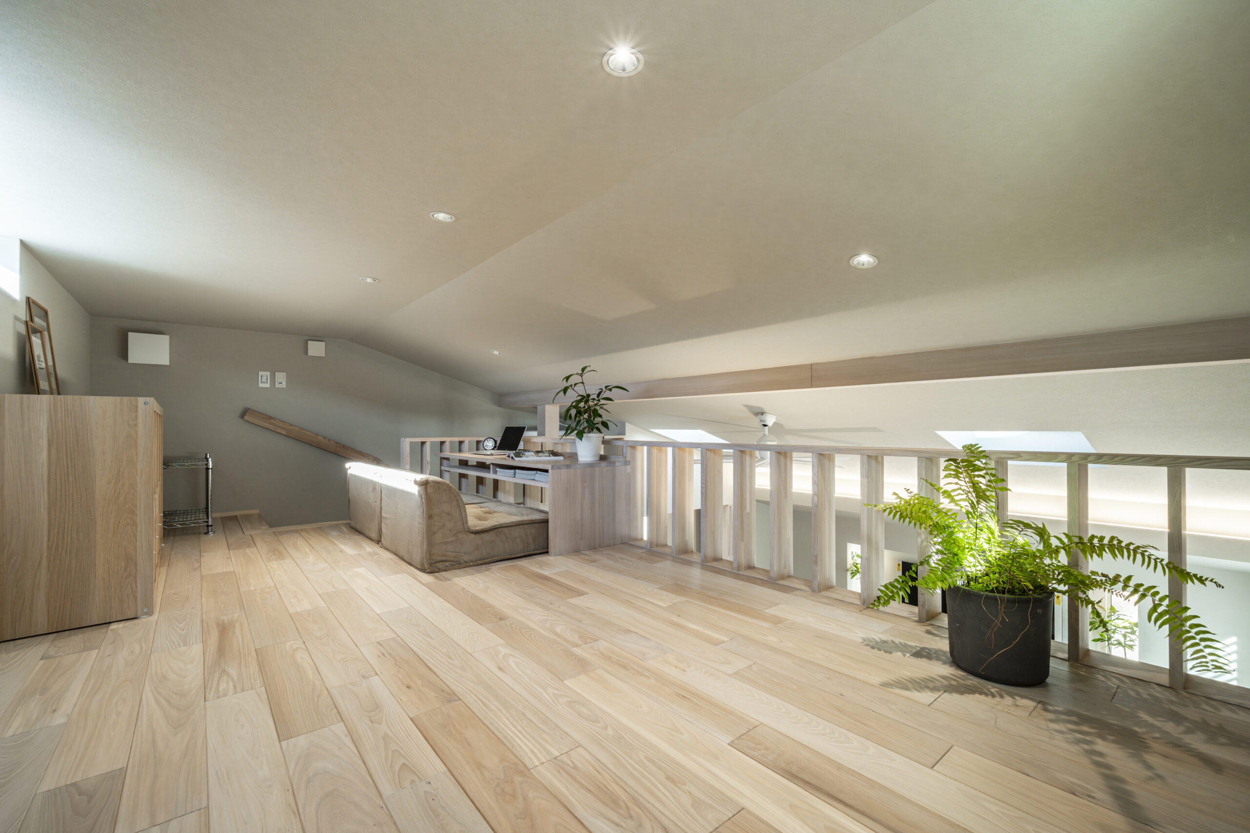 7畳のロフト空間は、あえて「低い天井」にすることで、包み込まれるような安心感を演出しました 。造作デスクでの学習や、お子様との遊び場など、多目的に活用可能です 。法規制による140cmという制限を逆手に取り、家族が一番リラックスできる「隠れ家」のような落ち着きある場所に仕上げました。