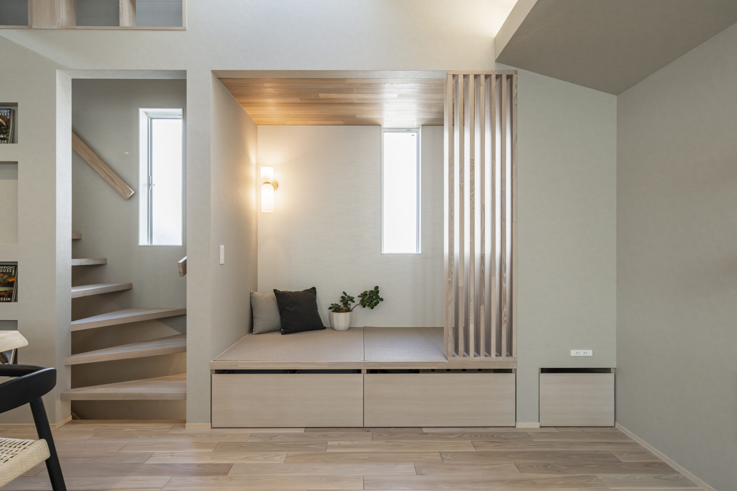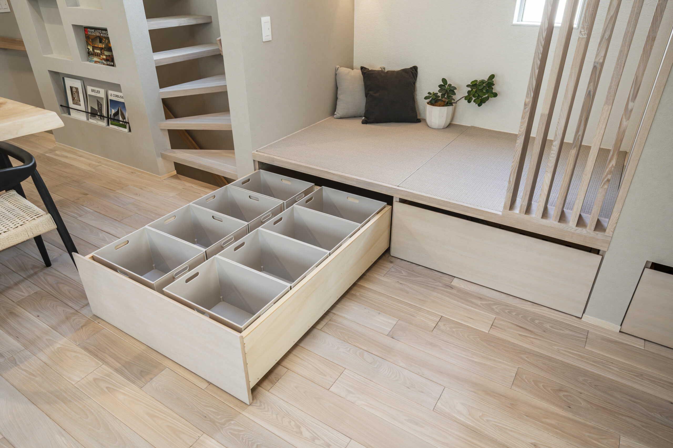 リビングの一角に設けた1.5畳のヌックは、ソファ以外でくつろげる貴重な居場所です 。下部はすべて引き出し収納になっており、お子様のおもちゃもスッキリ片付きます 。視線を少し変えるだけで、同じ空間にいながら「おこもり感」を味わえる、家族みんなが自然と集まりたくなる工夫のひとつです 。