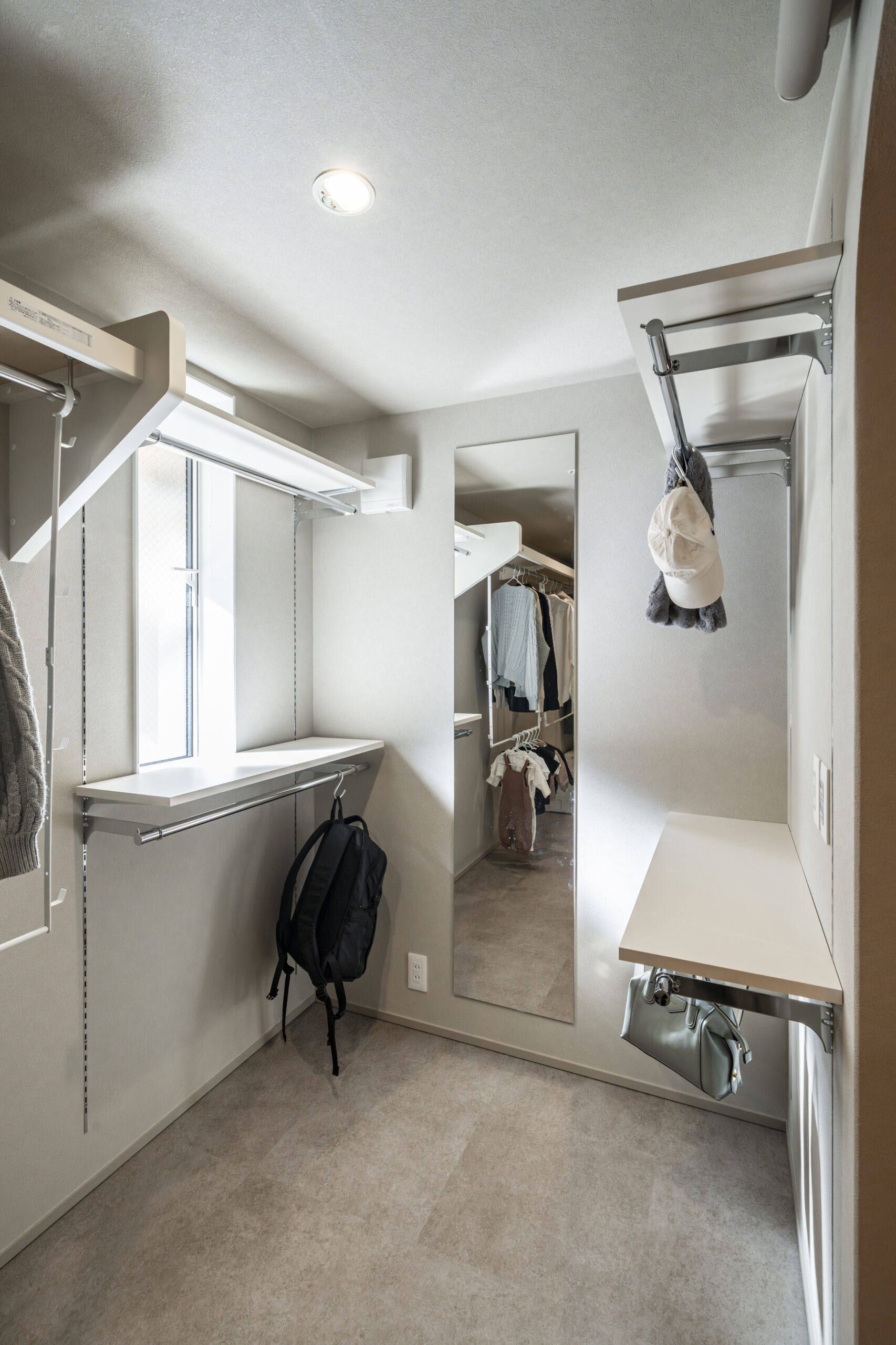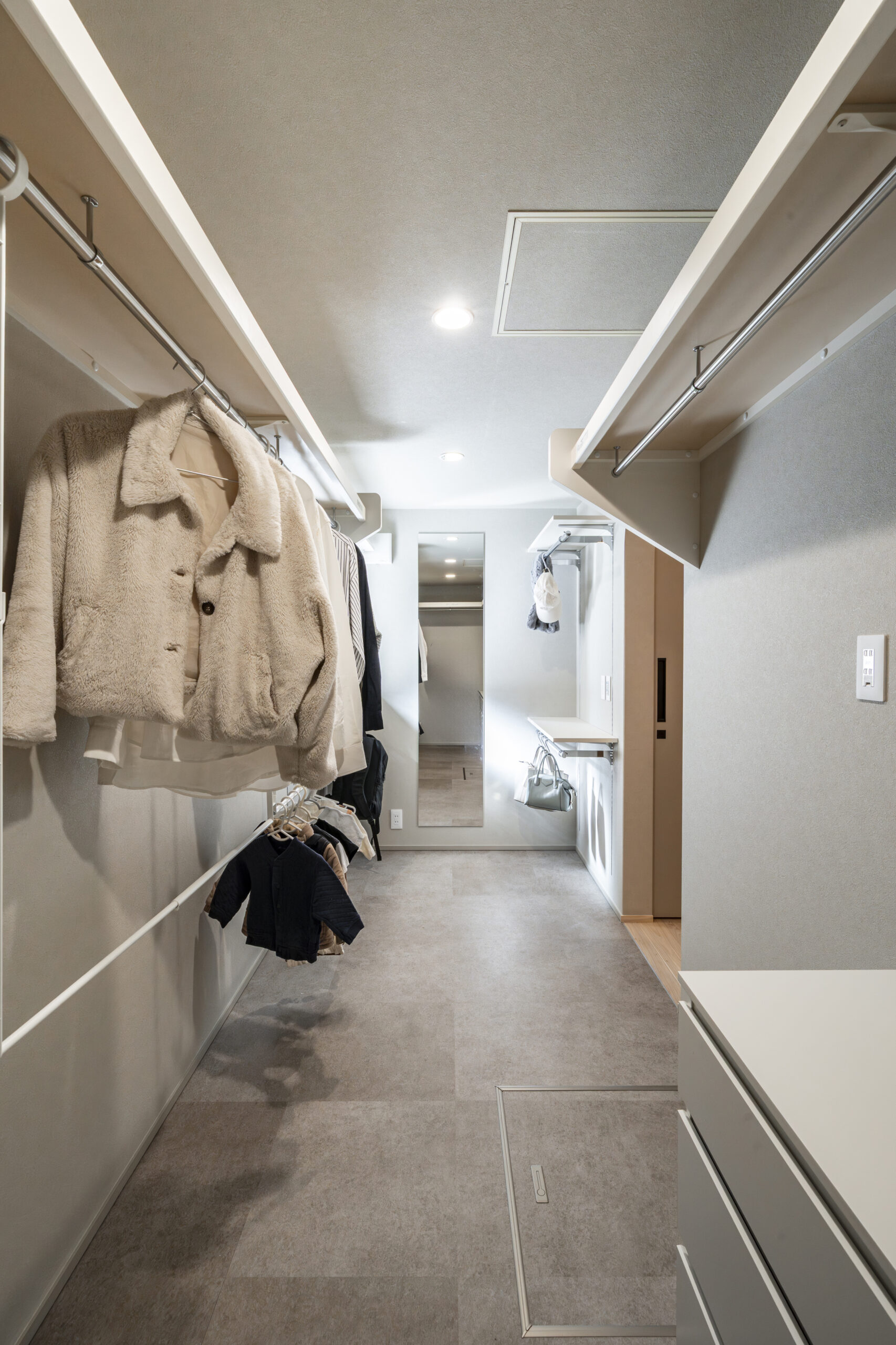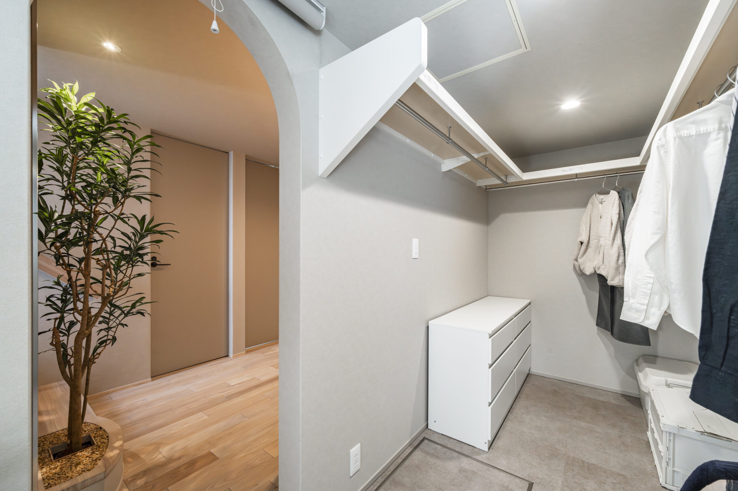 シャープな直線の中に、入り口を「R壁」にすることで空間に柔らかさをプラスしました 。4.5畳の広々とした空間は、衣類だけでなく災害備蓄品も保管できるキャパシティを確保 。あえて扉を設けず、クロスと同色のロールスクリーンで目隠しをする工夫により、圧迫感を抑えながら来客時の視線も賢く遮ります。