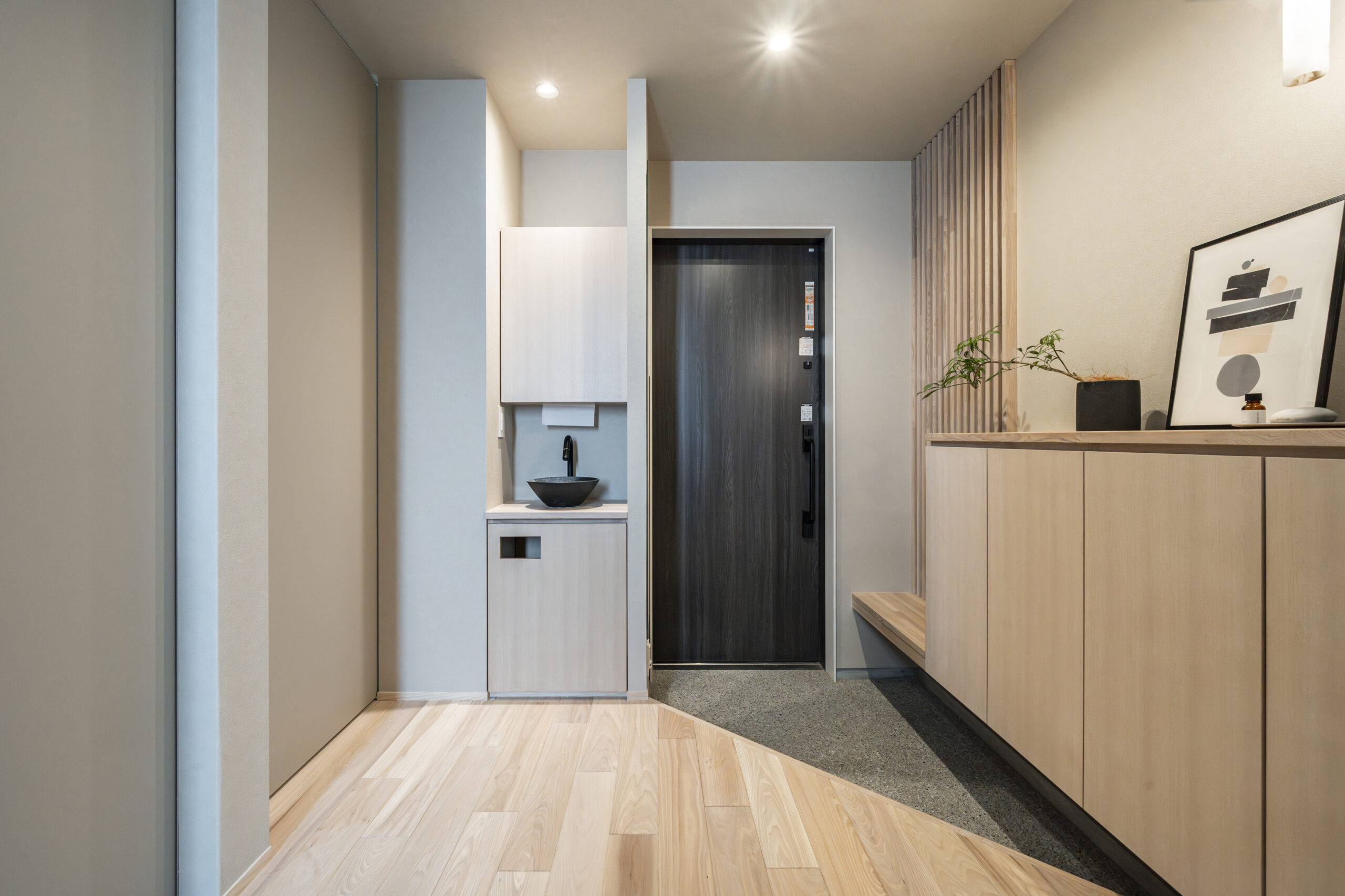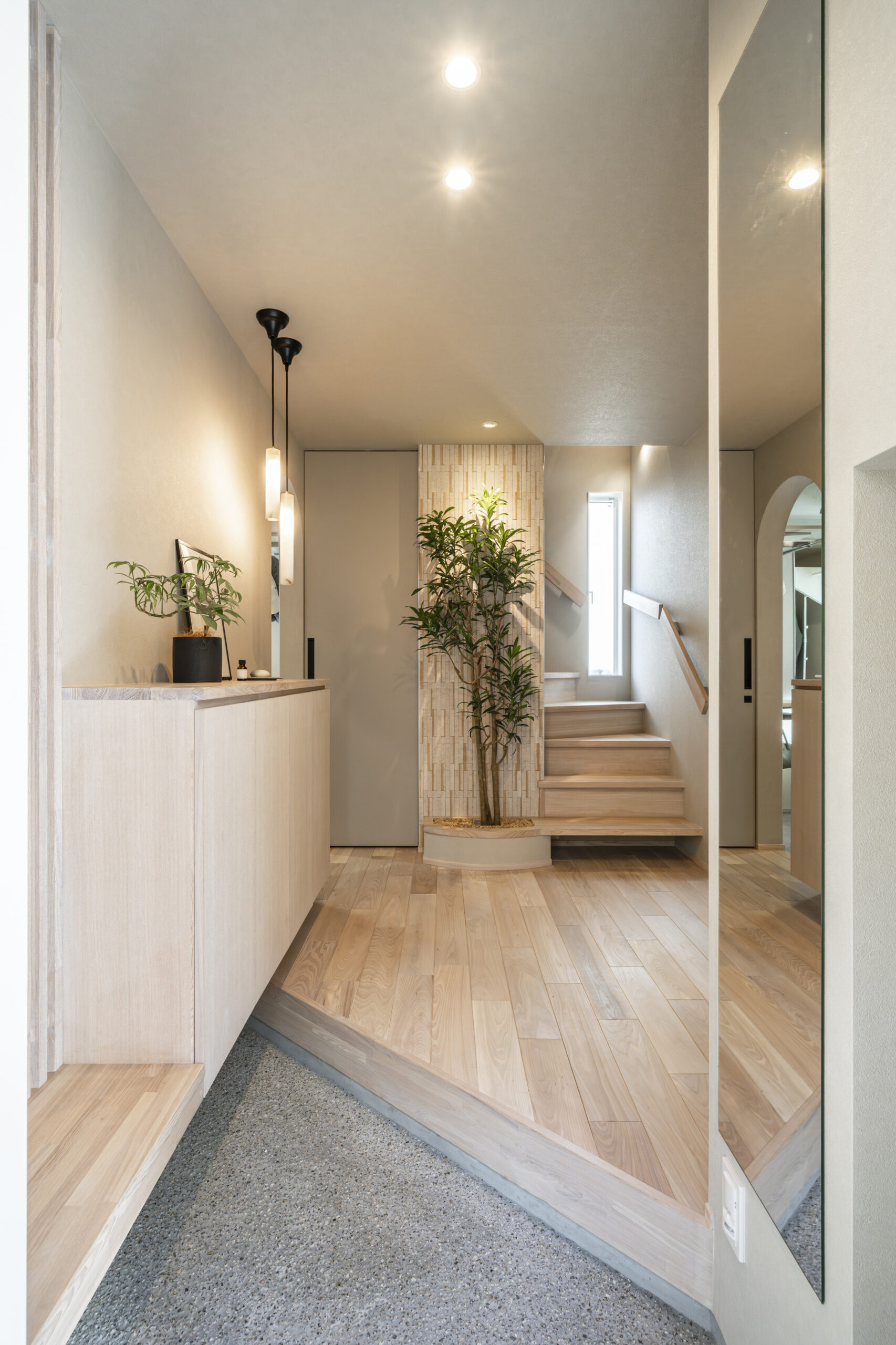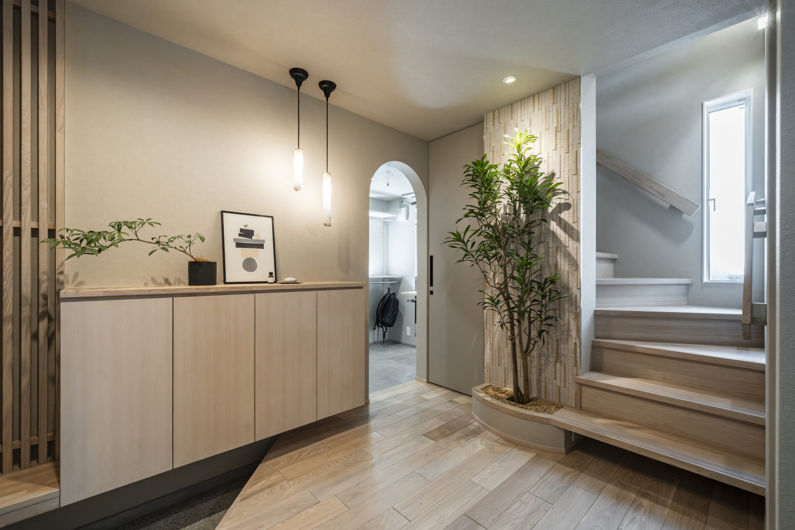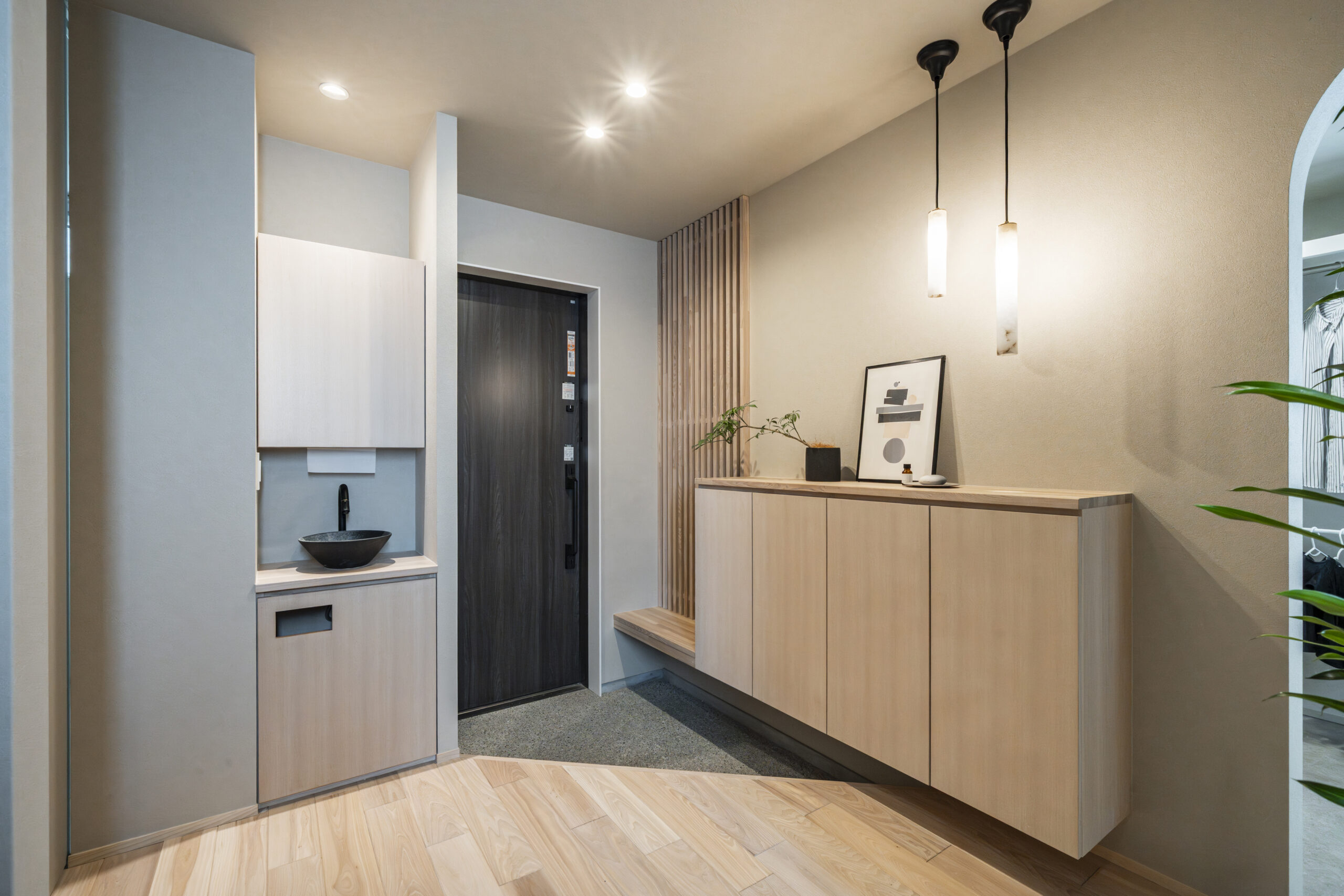 格子のベンチやエコカラット、ペンダントライトに「縦のライン」を連続させ、視覚的な統一感とリズムを演出しました 。土間には白い石を厳選した洗い出しを採用し、清潔感を表現 。お子様が靴を履きやすいよう設計された造作ベンチは、実用性とデザイン性を兼ね備えた、住まいの第一印象を決める主役です 。