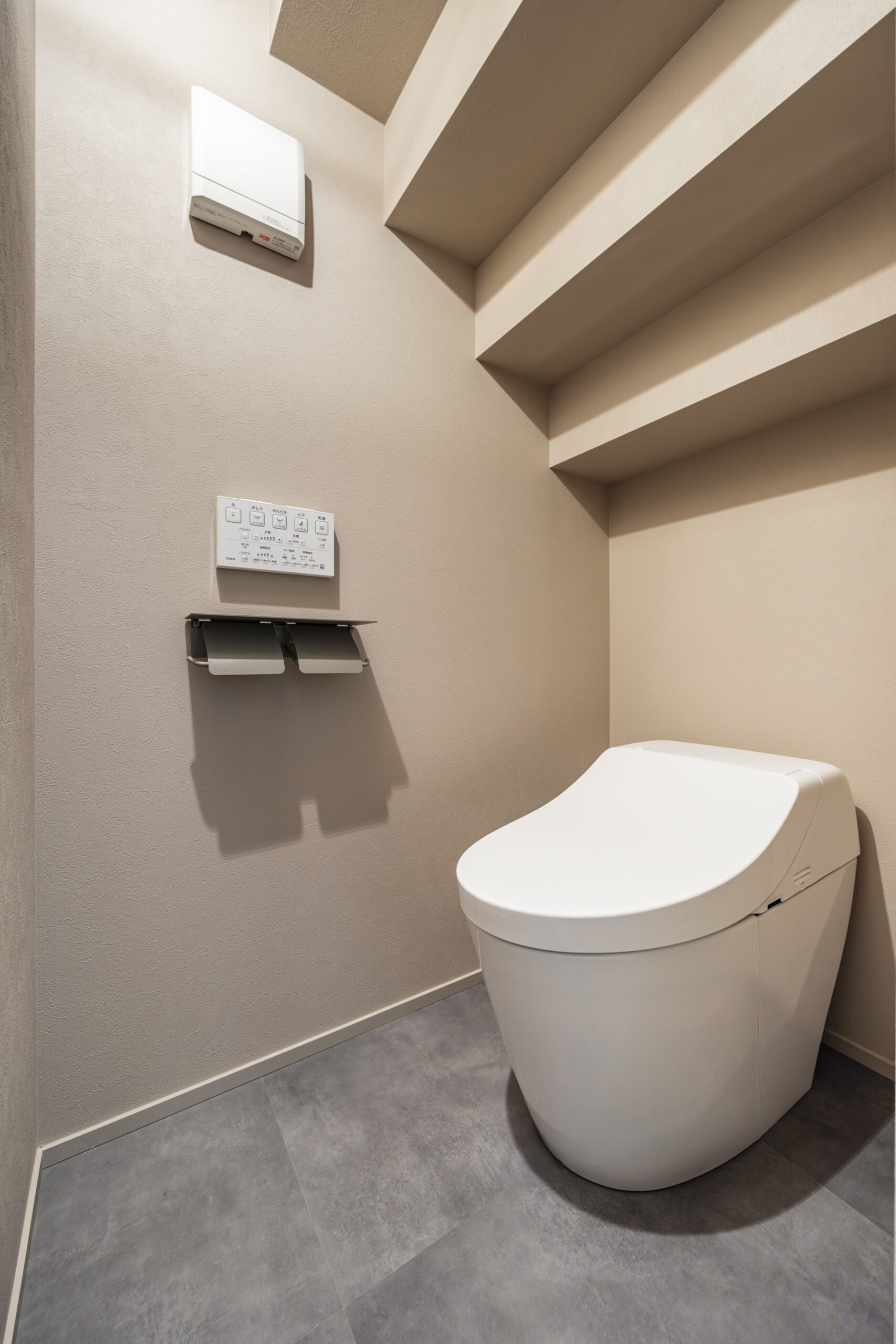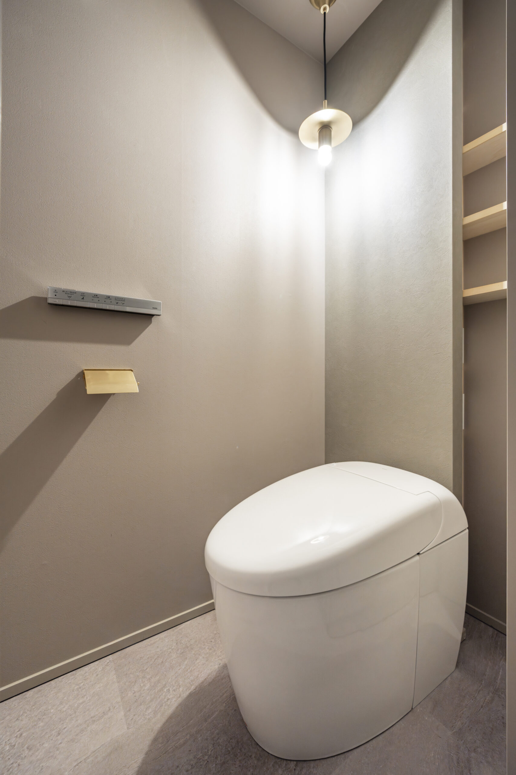 1階は階段下のデッドスペースを活かし、床を10cm下げることで開放感を確保した「こもり感」のある落ち着いた空間です。対して2階は、LDKの洗練された雰囲気をそのままに、生活感を徹底的に排除。トイレットペーパーなどの備品を壁の裏側に隠せる専用の造作壁を設け、ゲストも心地よく使えるノイズレスなデザインを追求しました。階ごとに役割と意匠を変えることで、住まい全体の完成度を高めています。