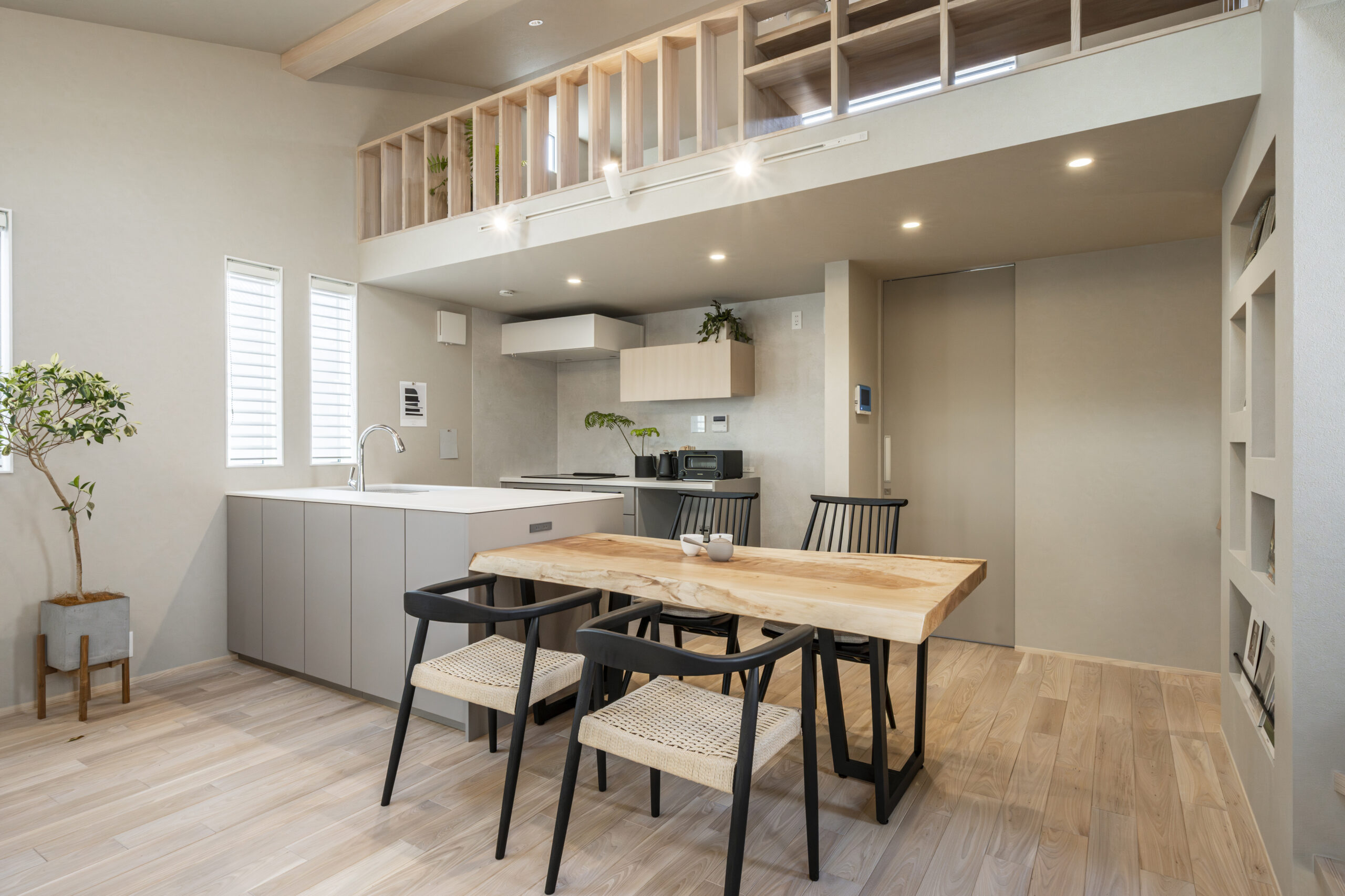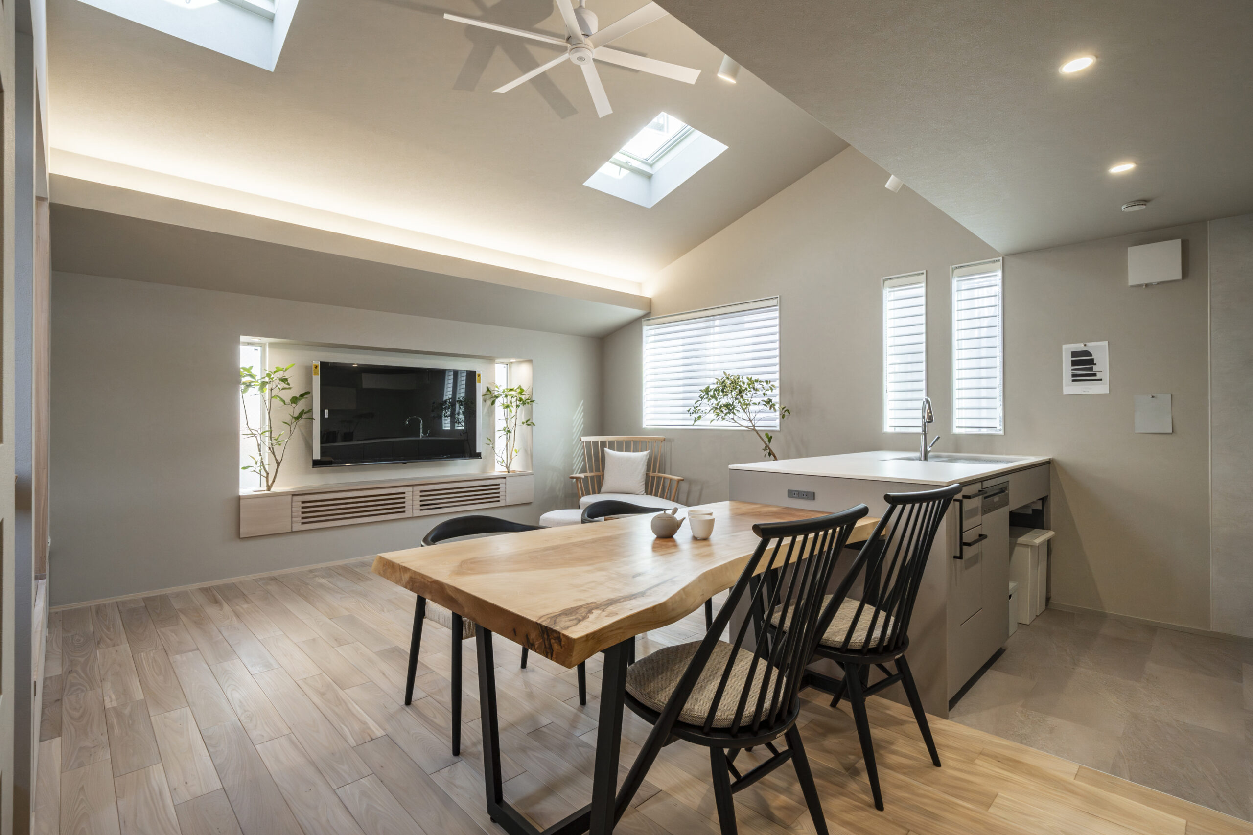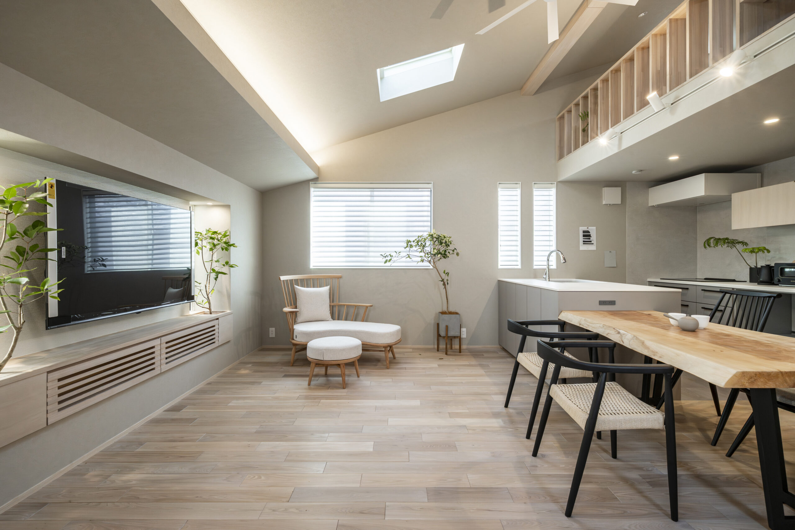 一枚板専門店で選び抜いた「栃(トチ)」のテーブルが、空間に圧倒的な存在感を放ちます 。床の色味に合わせた素材選びにより、無垢材の温かみがLDK全体に調和 。ジャパンディスタイルの根幹である「自然素材との融合」を象徴する場所として、日々の食事の時間をより豊かで贅沢なものへと変えてくれます。