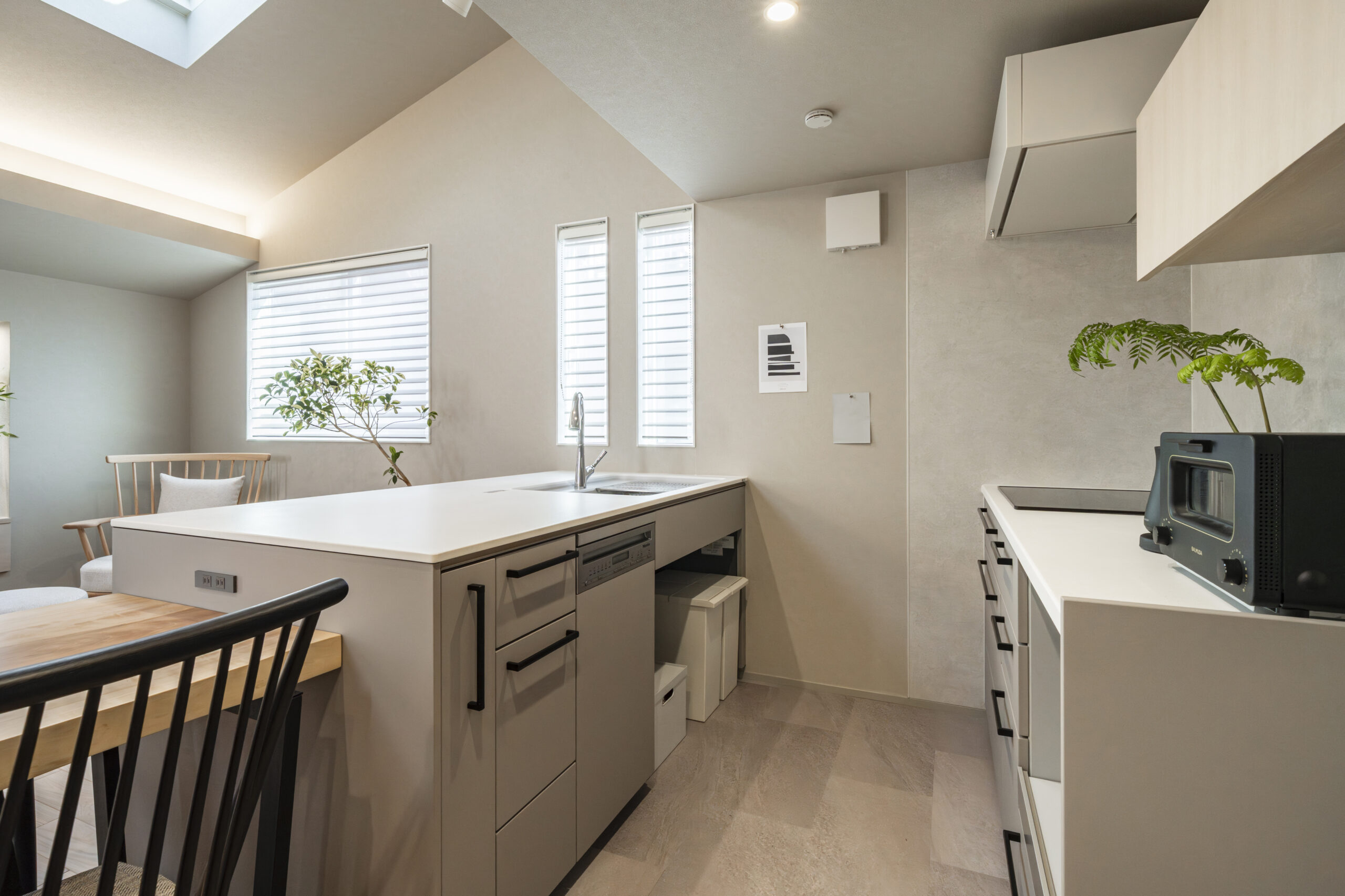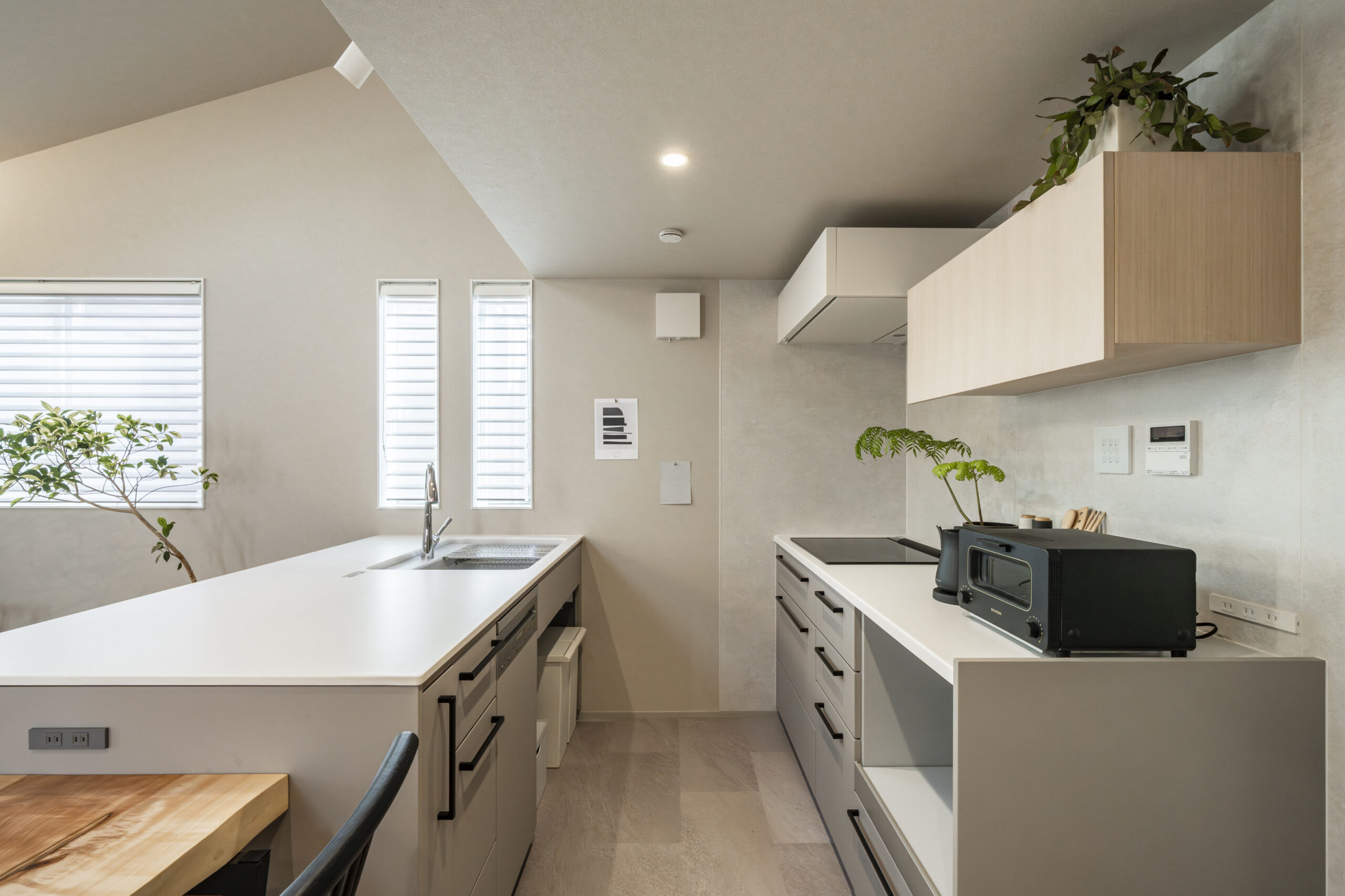 デザイン性とマットな質感が決め手のトクラス製キッチンを採用 。レンジフードはtoolboxを合わせ、すっきりとした印象に仕上げました 。壁面のマグネットパネルは、美観を損なわずにお子様のプリント類を貼れる便利なスペース 。メーカー既製品の自由度を活かし、使い勝手と意匠性を徹底的に追求しています。