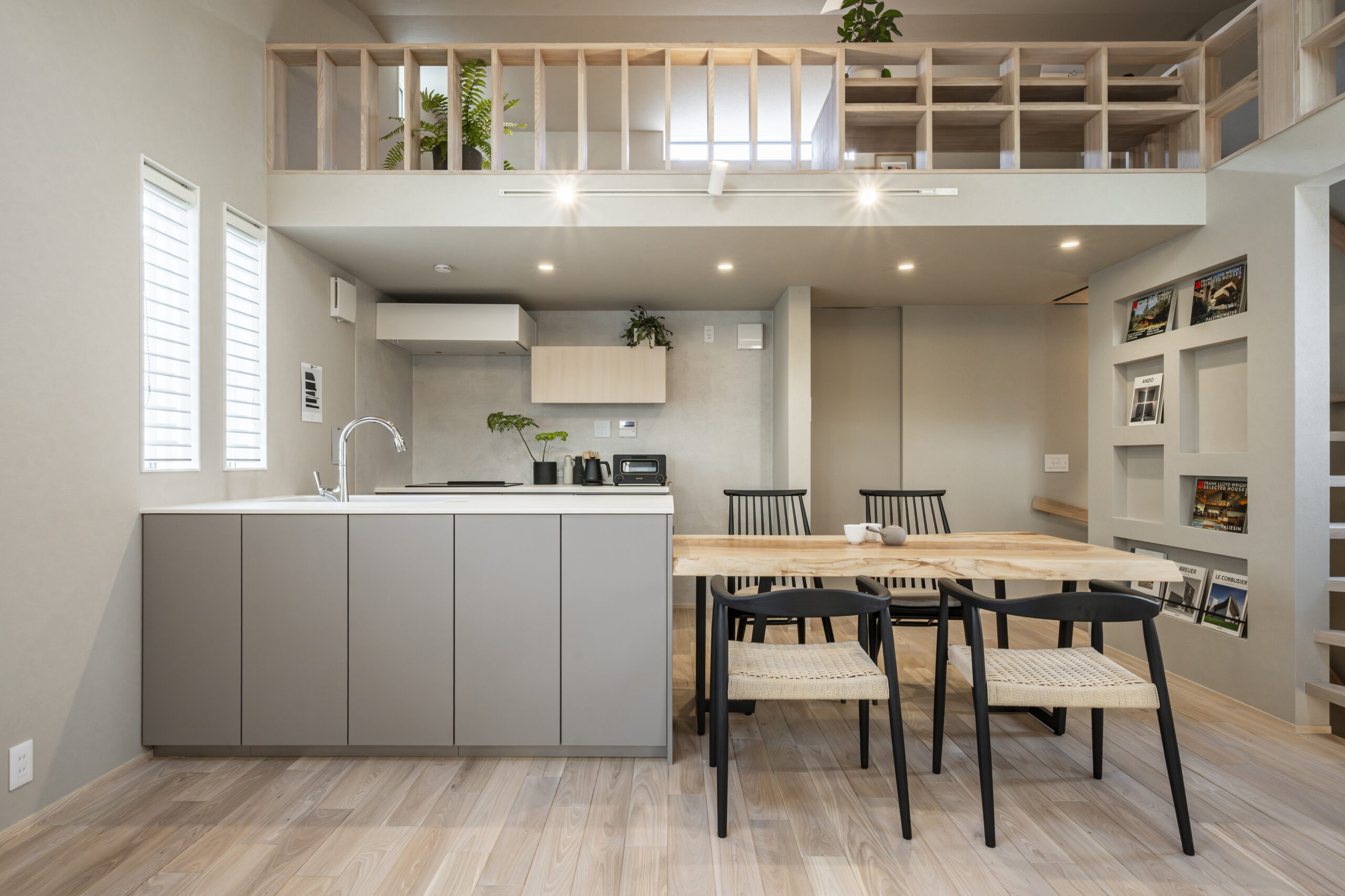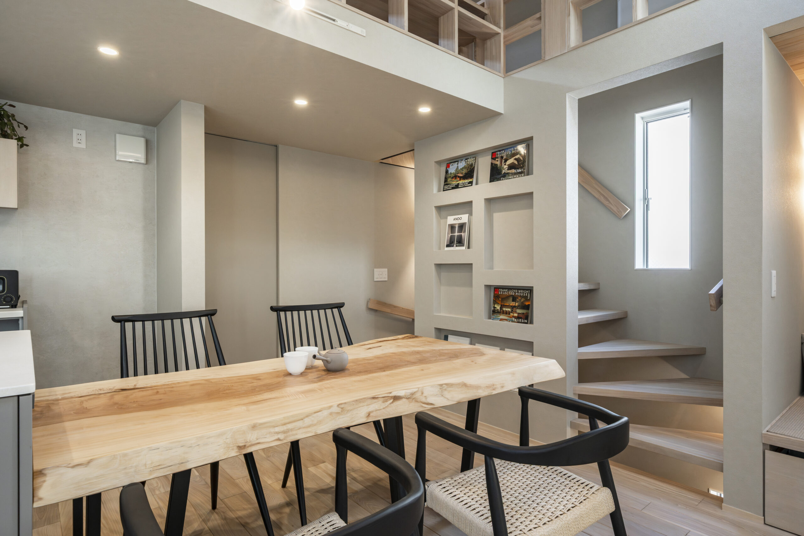 階段の造作と植栽の鉢を一体化させ、室内でありながら石を配した情緒ある植栽エリアを設けています。限られた床面積の中でも、視線が抜ける「余白」をあえて作ることで、1階フロア全体に圧迫感を感じさせない贅沢なゆとりをもたらしました。