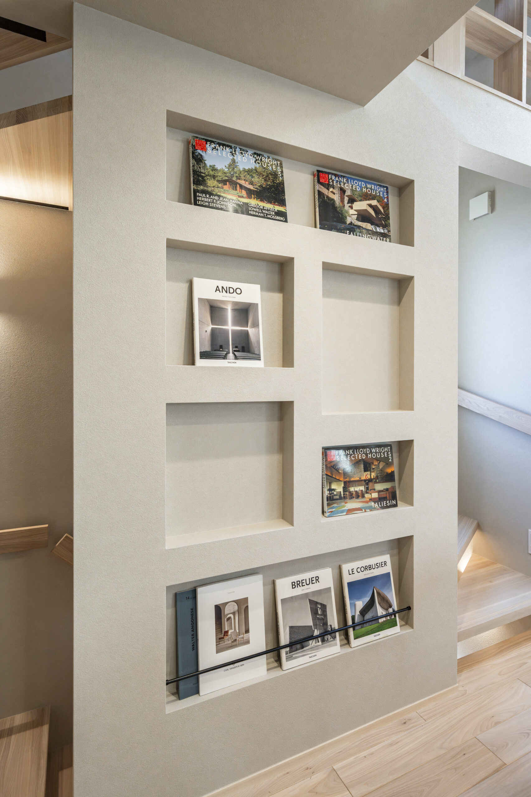階段横の壁面を活用し、マガジンラックや神棚、そしてお子様の作品を飾るための複数のニッチ(飾り棚)を設けました。通るたびに思い出が目に入るこのスペースは、住まいの中心にある小さな美術館のような存在。デッドスペースを「意味のある場所」に変えることで、狭小住宅とは思えないほどの心のゆとりと、家族のコミュニケーションを生み出しています。