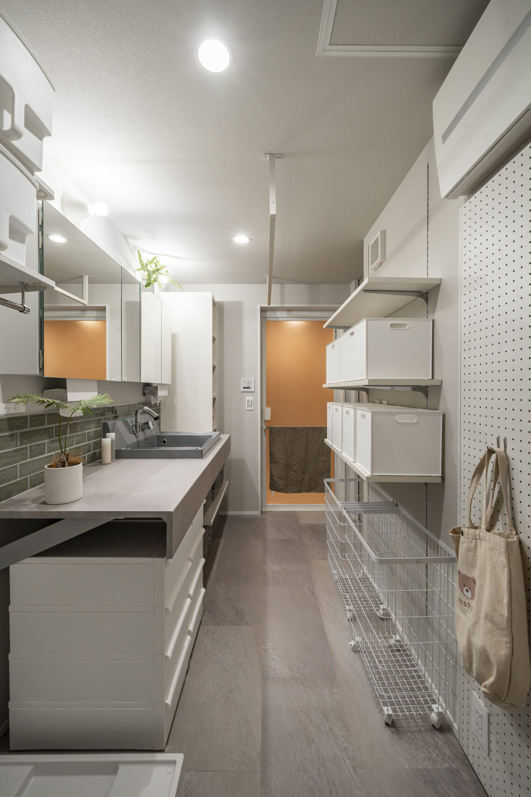 洗面脱衣室では「洗う・拭く・捨てる」をその場で完結できる動線を追求しました。洗濯機横には、乾燥後の衣類をその場で畳み、すぐに収納できる造作カウンターと棚を配置。下着やハンガー収納を最短距離に集約することで、日々の「名もなき家事」の負担を大幅に軽減します。リビングのトーンと合わせた内装で、生活感を感じさせない上質な空間に仕上げました。
