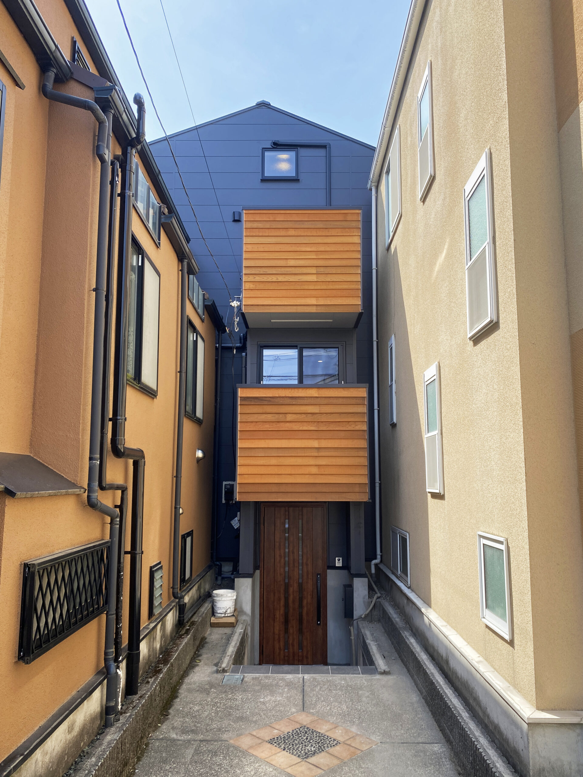 建物の顔となる外観には、深みのある黒のSto塗り壁を採用しました。周囲の建物に囲まれた立地ながら、シックで落ち着いた佇まいが際立ちます。バルコニー部分には木をあしらい、温かみのあるアクセントをプラス。無機質になりがちな黒の外観に柔らかさを与えると同時に、年月を重ねるごとに変化する木の風合いも楽しめます。